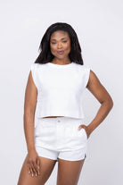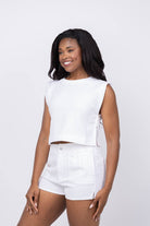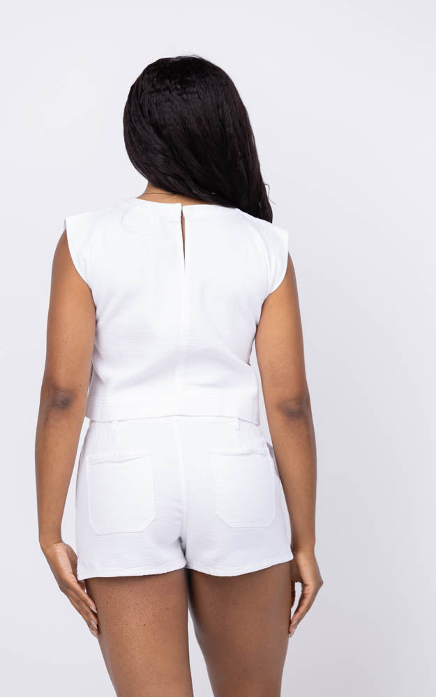 The Arlo Top redefines simplicity with thoughtful details that elevate your everyday look. Crafted from crisp white woven pique, this sleeveless shirt features a flattering round collar, wide hem, and side openings secured by button loops for subtle style and comfort. A charming peekaboo button at the back adds a unique touch. Pair it effortlessly with The Arlo Short for a fresh, relaxed outfit that feels anything but basic.