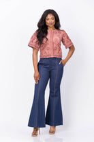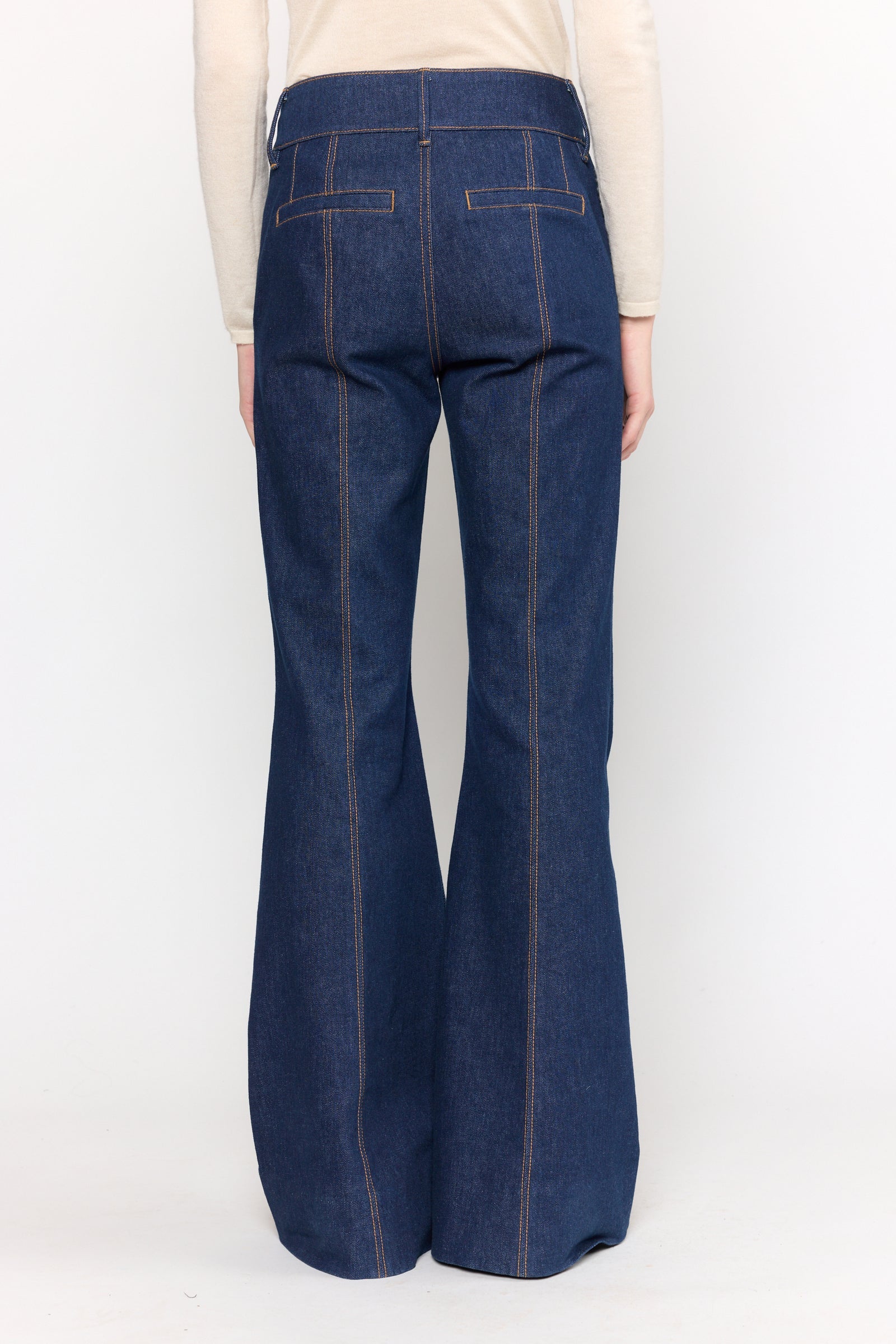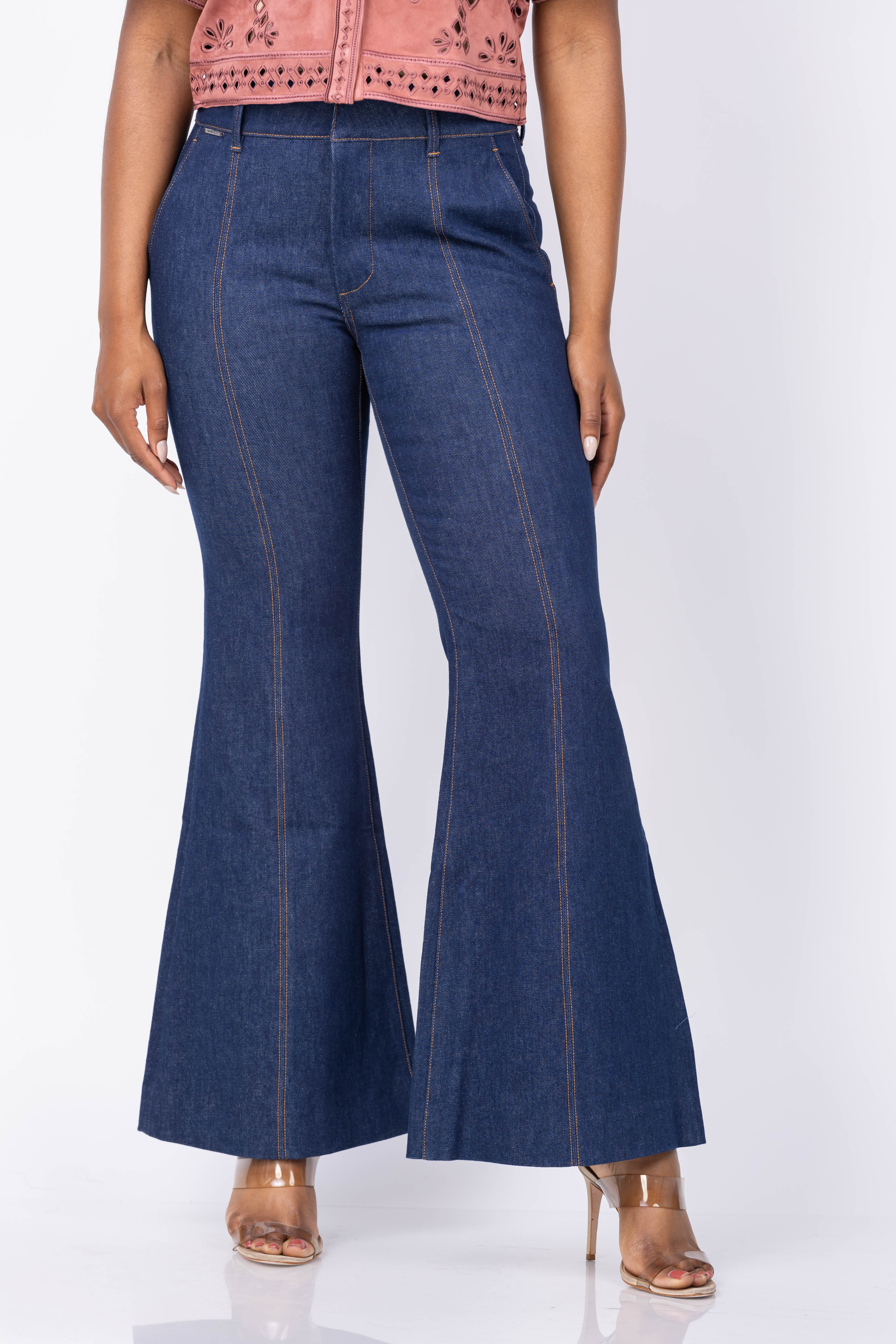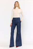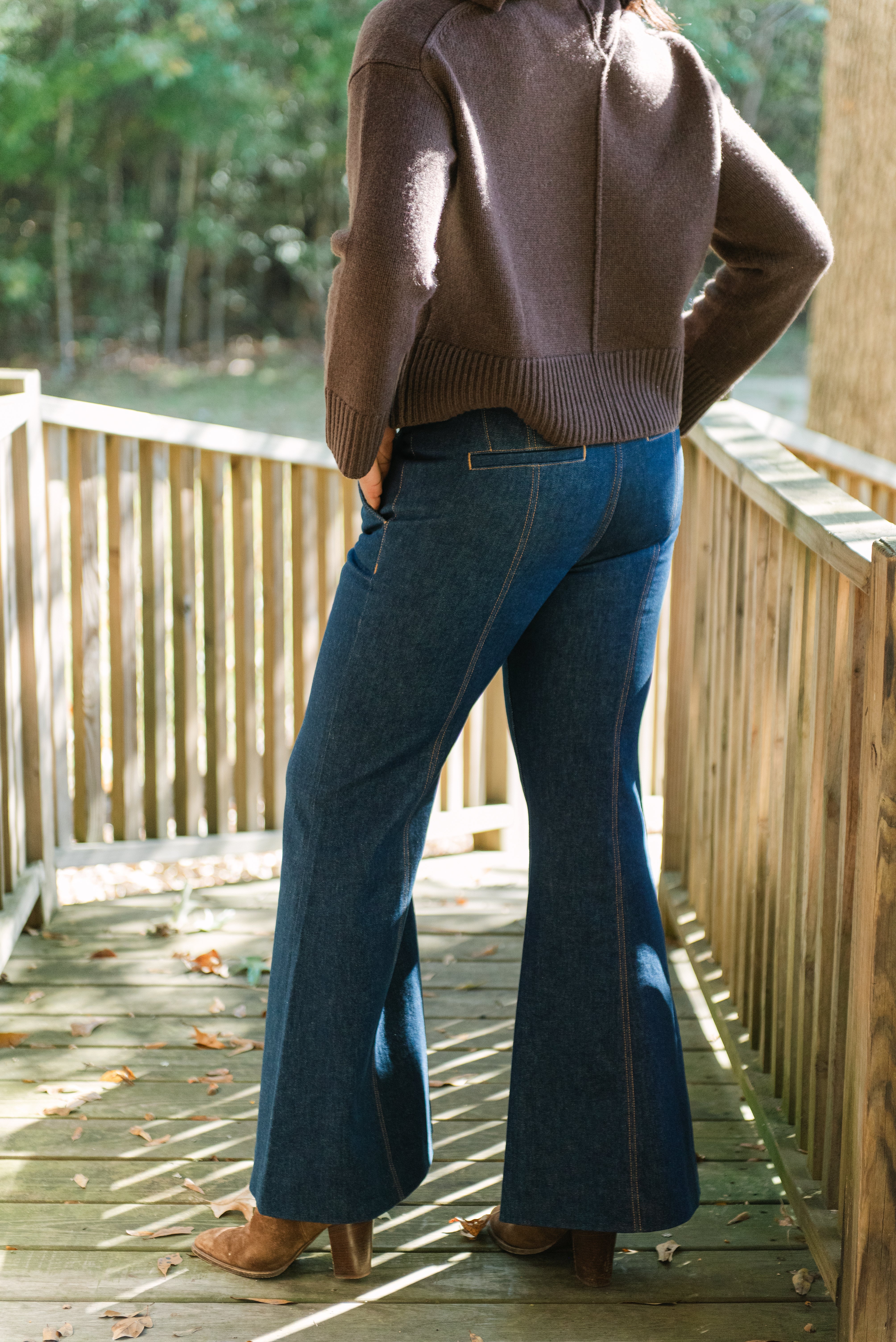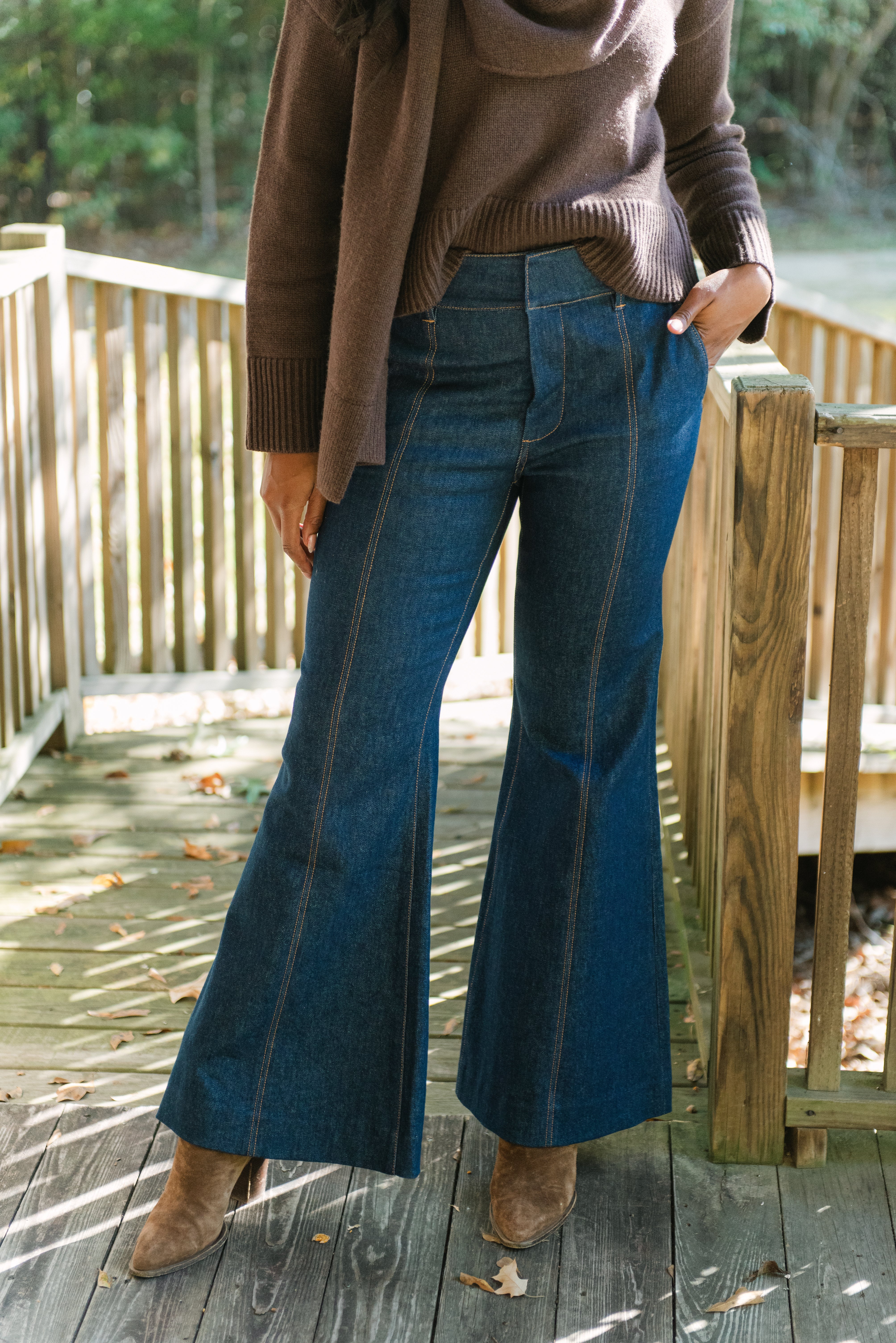 Discover the Christy Lynn Rowen Pant in Dark Indigo, a fresh take on classic denim. Featuring a flattering floor-length flare and a flat waistband for a secure, adjustable fit, these pants blend style and comfort effortlessly. Practical side and back pockets are complemented by decorative stitching along each leg, adding a tailored, polished look. Perfect for those who want denim that stands out with sophistication and ease.