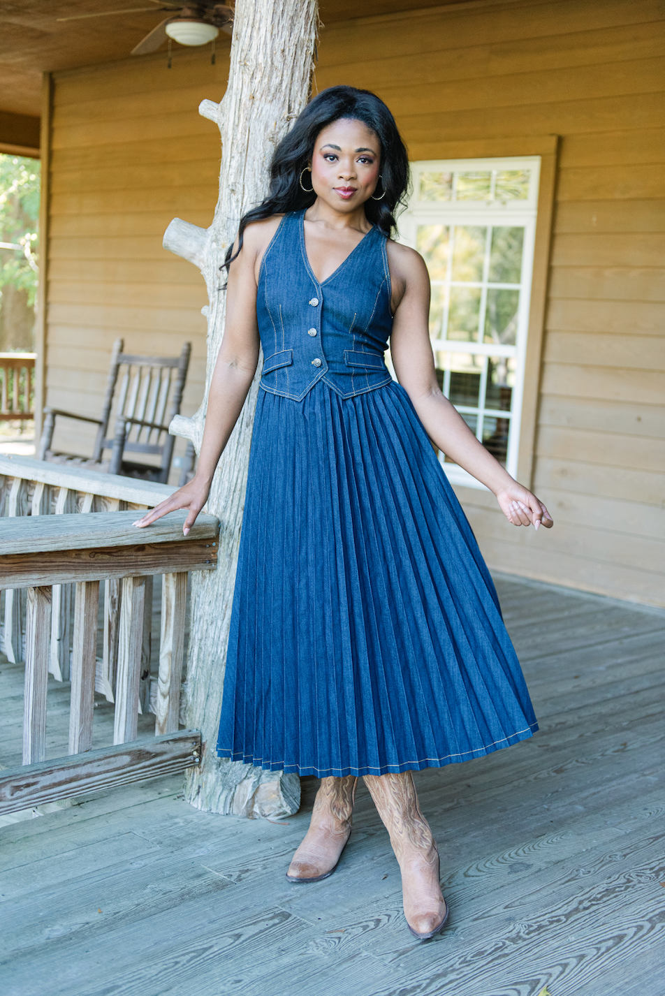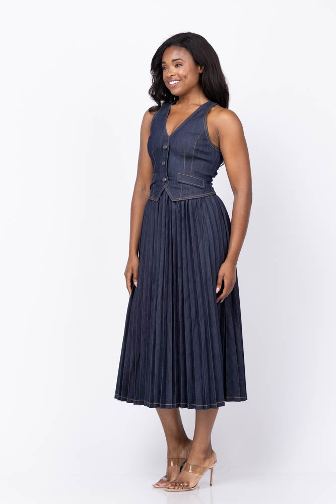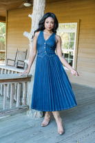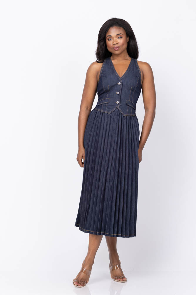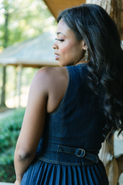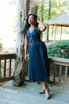 The Cinq à Sept Esther Dress in Indigo is a timeless piece designed to enhance your wardrobe. Featuring a sleeveless silhouette with a graceful V-neckline and a pleated midi-length skirt, it moves beautifully with every step. Elegant button-up front details and a concealed back zipper ensure a polished fit, making this dress perfect for any occasion where understated sophistication is key.