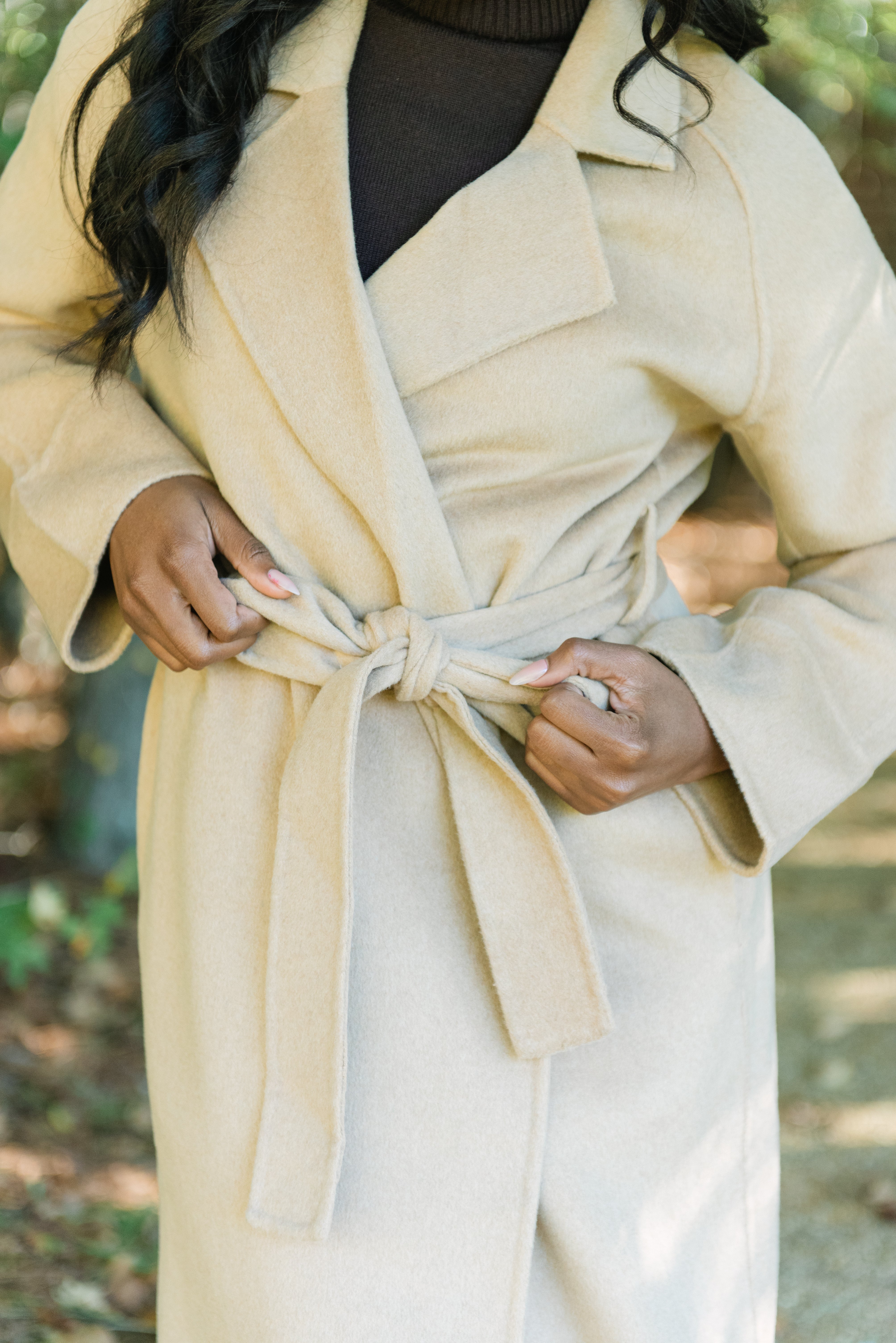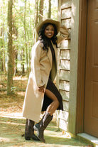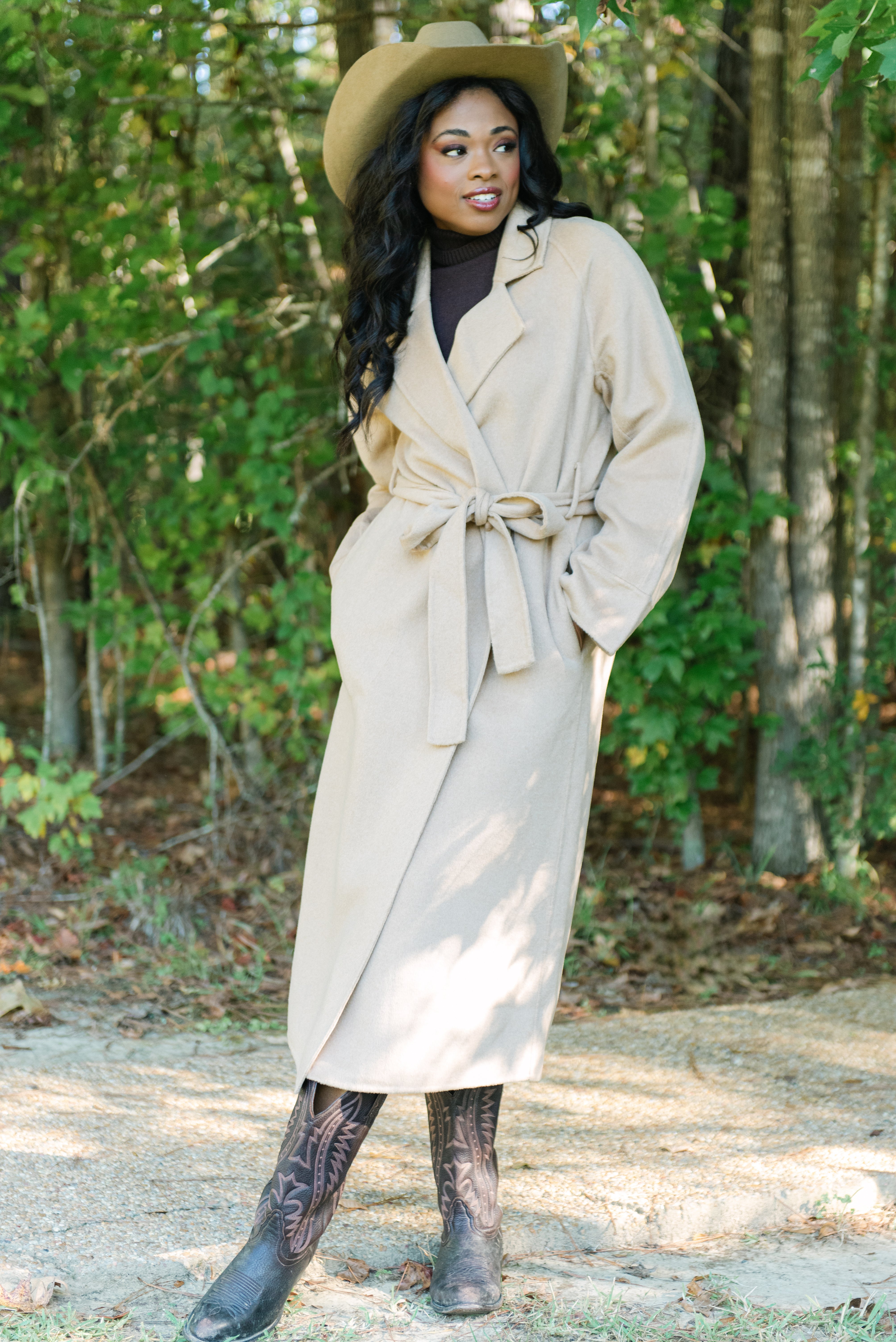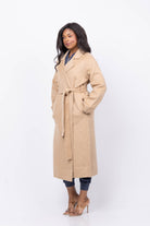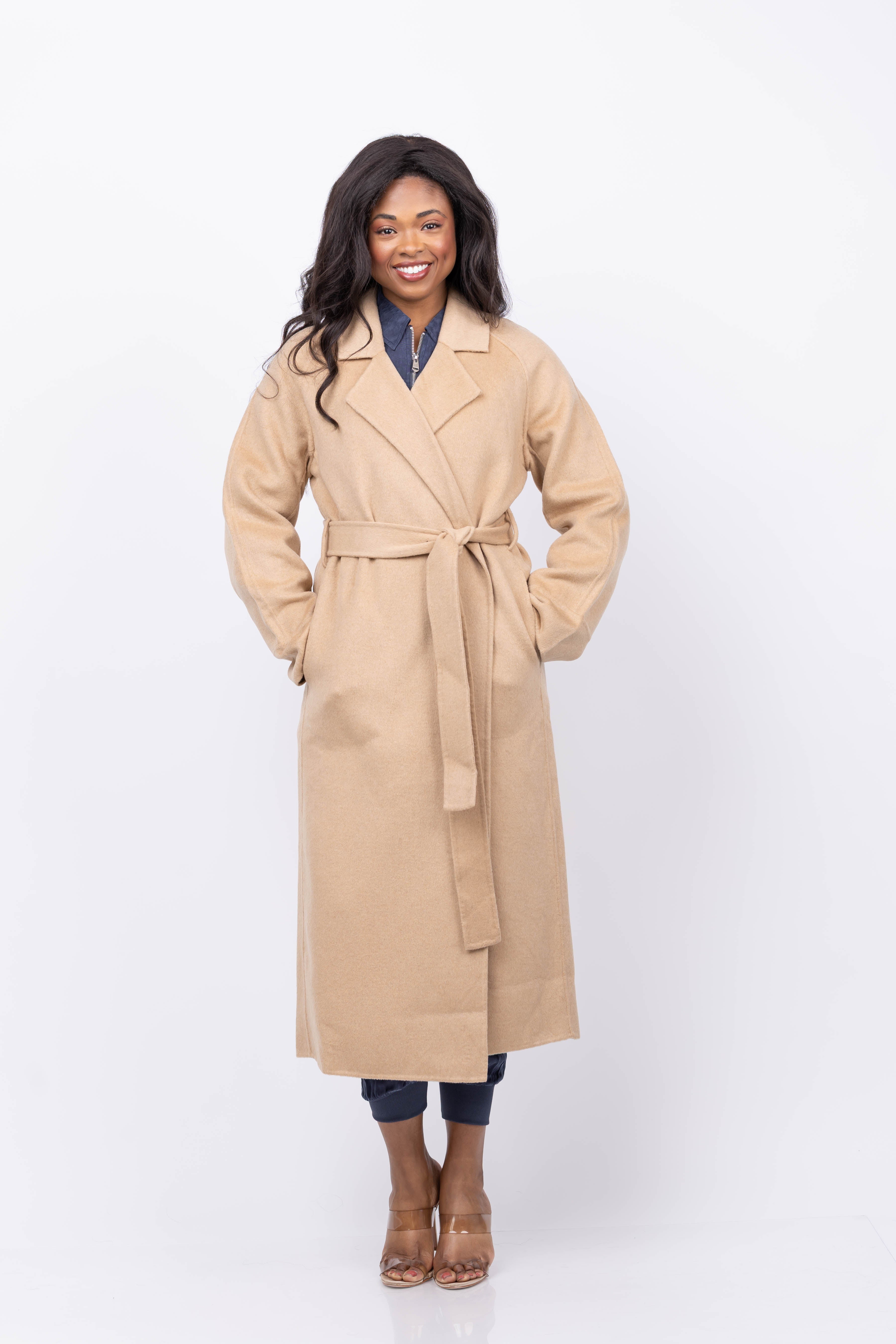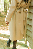 The Favorite Daughter The Paola Coat in Camel is your go-to layer as temperatures fall. Crafted from luxuriously soft double-faced wool, this 50.5" full-length coat offers a perfect blend of relaxed comfort and polished style. Its classic silhouette is enhanced by a waist-cinching tie belt, creating a flattering shape that’s both timeless and chic. Embrace warmth and elegance year after year with this essential addition to your wardrobe.