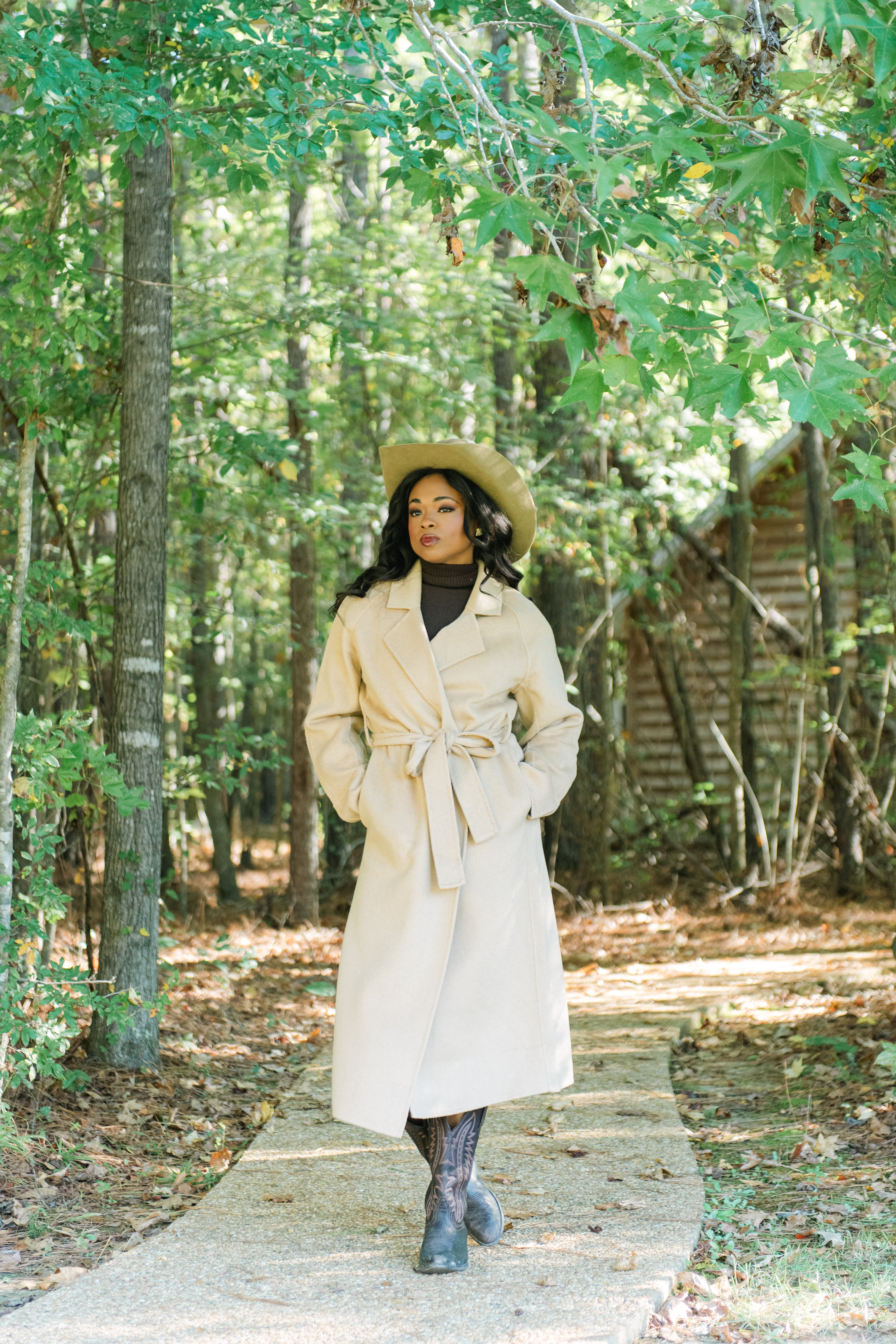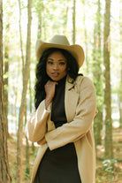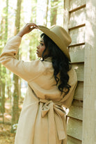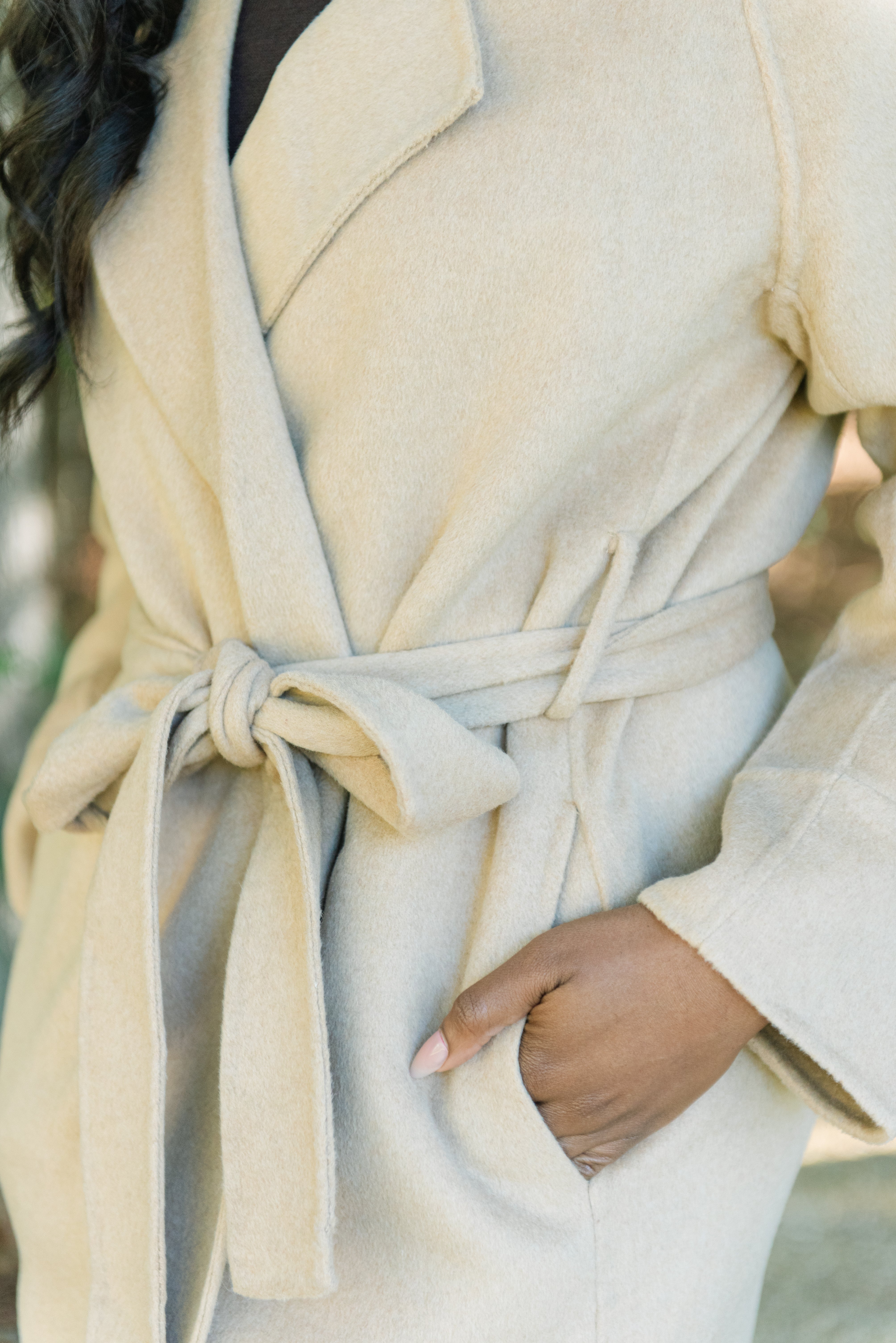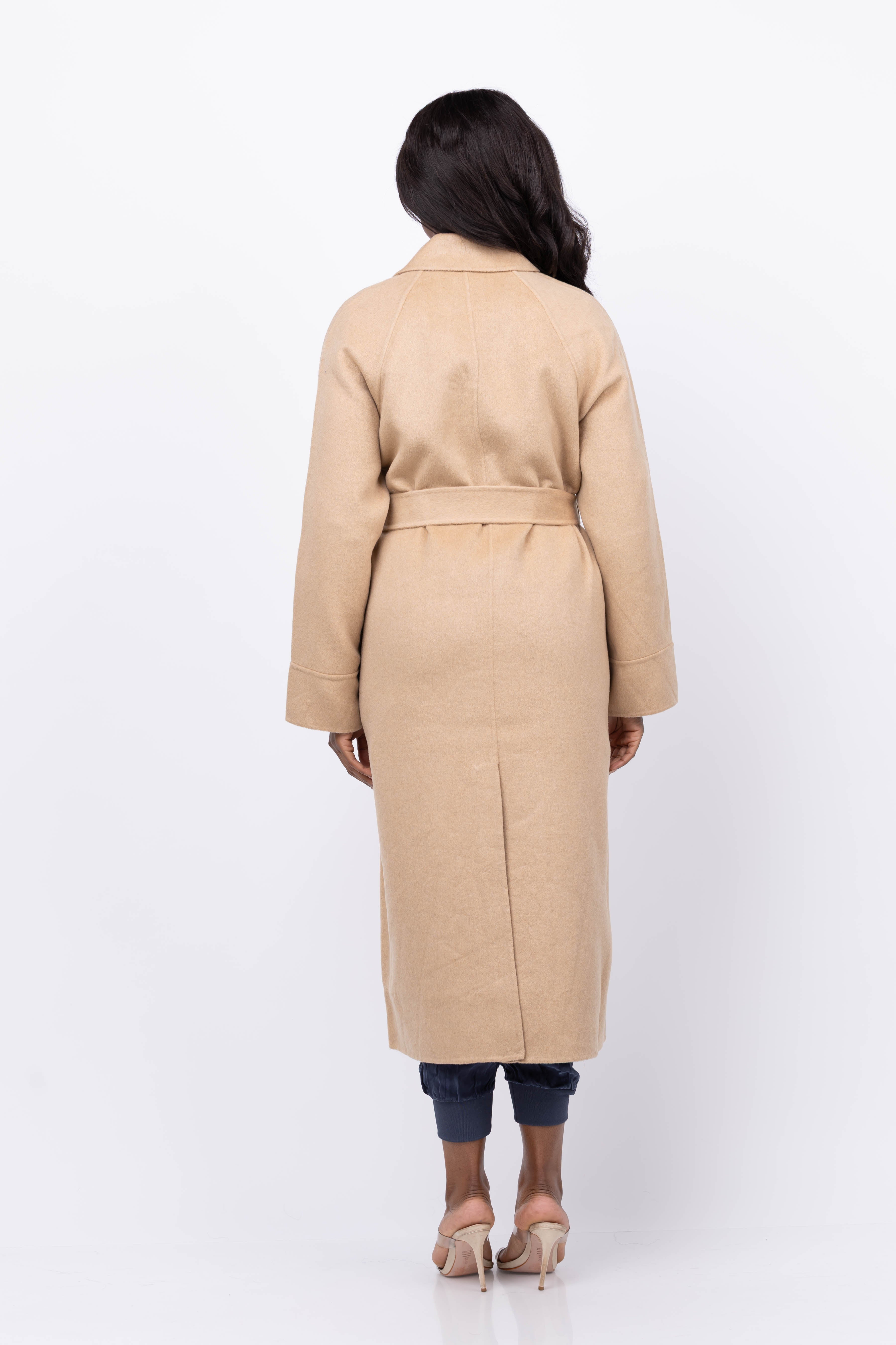 The Favorite Daughter The Paola Coat in Camel is your go-to layer as temperatures fall. Crafted from luxuriously soft double-faced wool, this 50.5" full-length coat offers a perfect blend of relaxed comfort and polished style. Its classic silhouette is enhanced by a waist-cinching tie belt, creating a flattering shape that’s both timeless and chic. Embrace warmth and elegance year after year with this essential addition to your wardrobe.