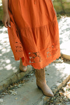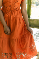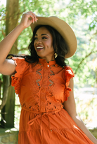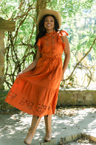 The Love The Label Romy Dress in Cinnamon combines breezy comfort with timeless femininity. Featuring flutter sleeves, delicate lace insets, and a flattering self-tie waist, this midi dress effortlessly elevates your style with graceful movement and charm.