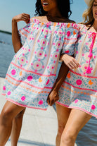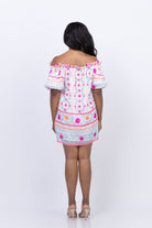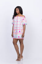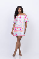 Elevate your style with the Juliet Dunn Off the Shoulder Mexican Print Dress. This vibrant fuchsia dress features a tight bust and flowy hemline, adorned with a stunning Mexican print complete with mirrors and embroidery. Perfect for a touch of sparkle at any day or evening occasion.
