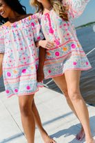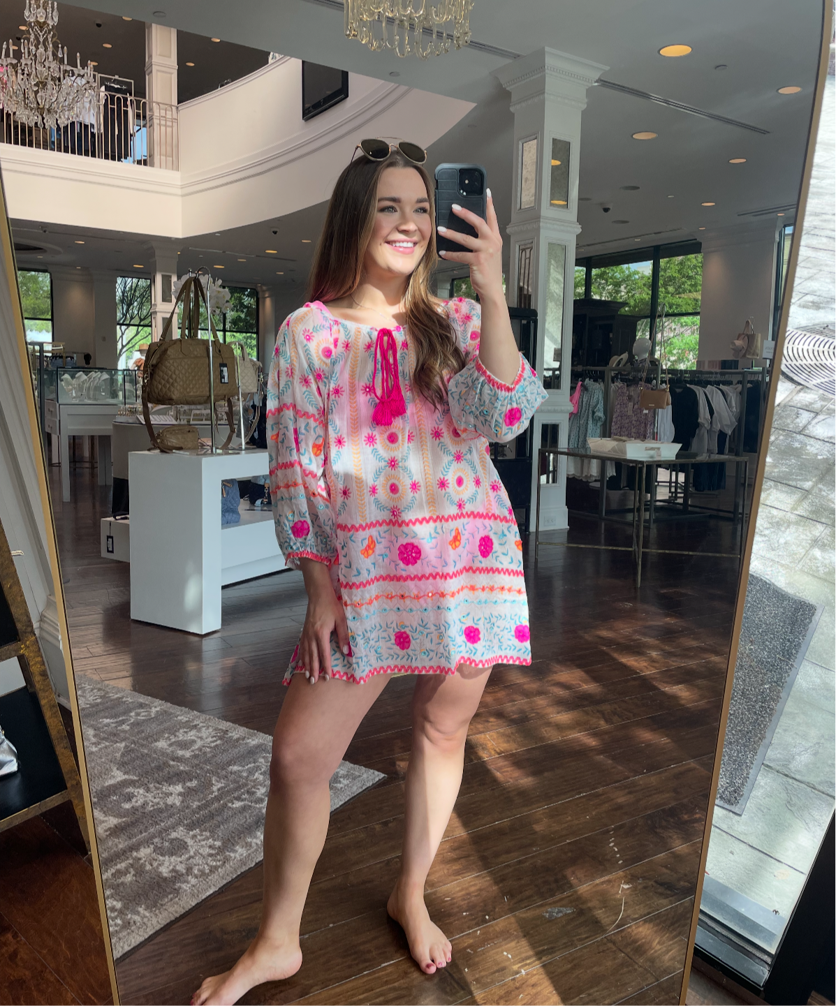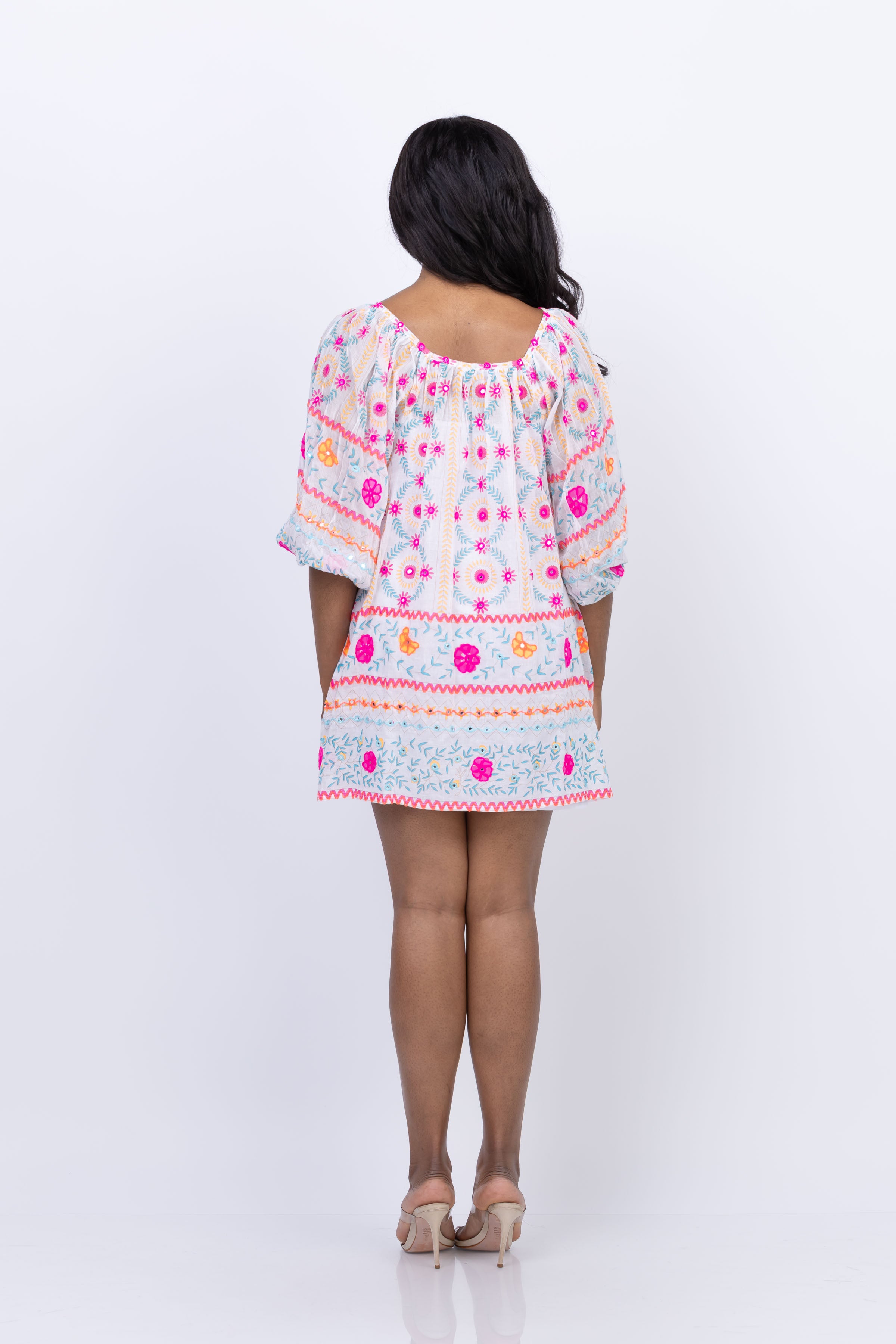 Elevate your Summer style with the Juliet Dunn Boho Mexican Print Cover-Up! Hand embroidered with a striking print, featuring mirrors and contrast embroidery, this sheer, oversized cover up is perfect for standing out on your next holiday. Size down for a snug fit and be the envy of everyone around you!