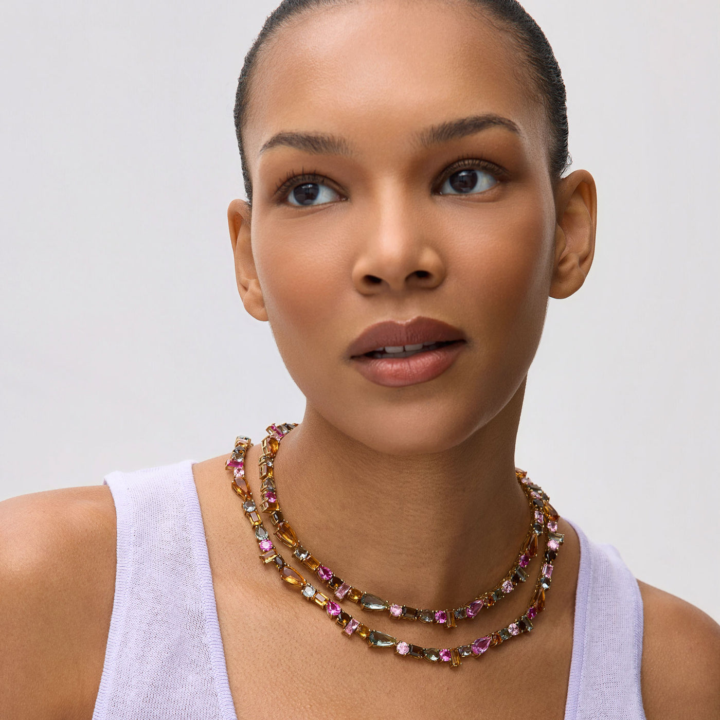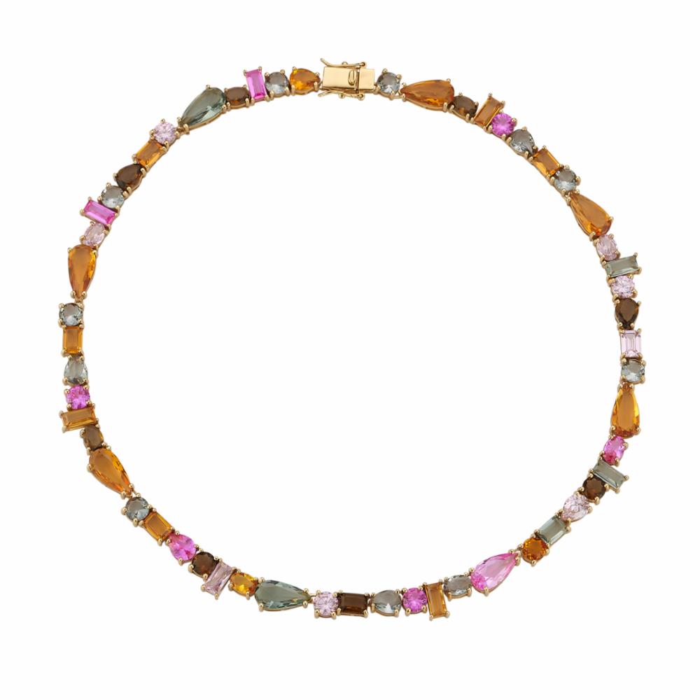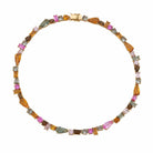 The Mignonne Gavigan Cassidy Necklace in Multi dazzles with alternating pink, green, and amber crystals arranged in a stunning gradient. This modern twist on a classic tennis necklace sits elegantly at the collarbone, perfect for layering or making a bold, colorful statement on its own. Add vibrant sparkle and timeless style to any outfit with this versatile and eye-catching piece.