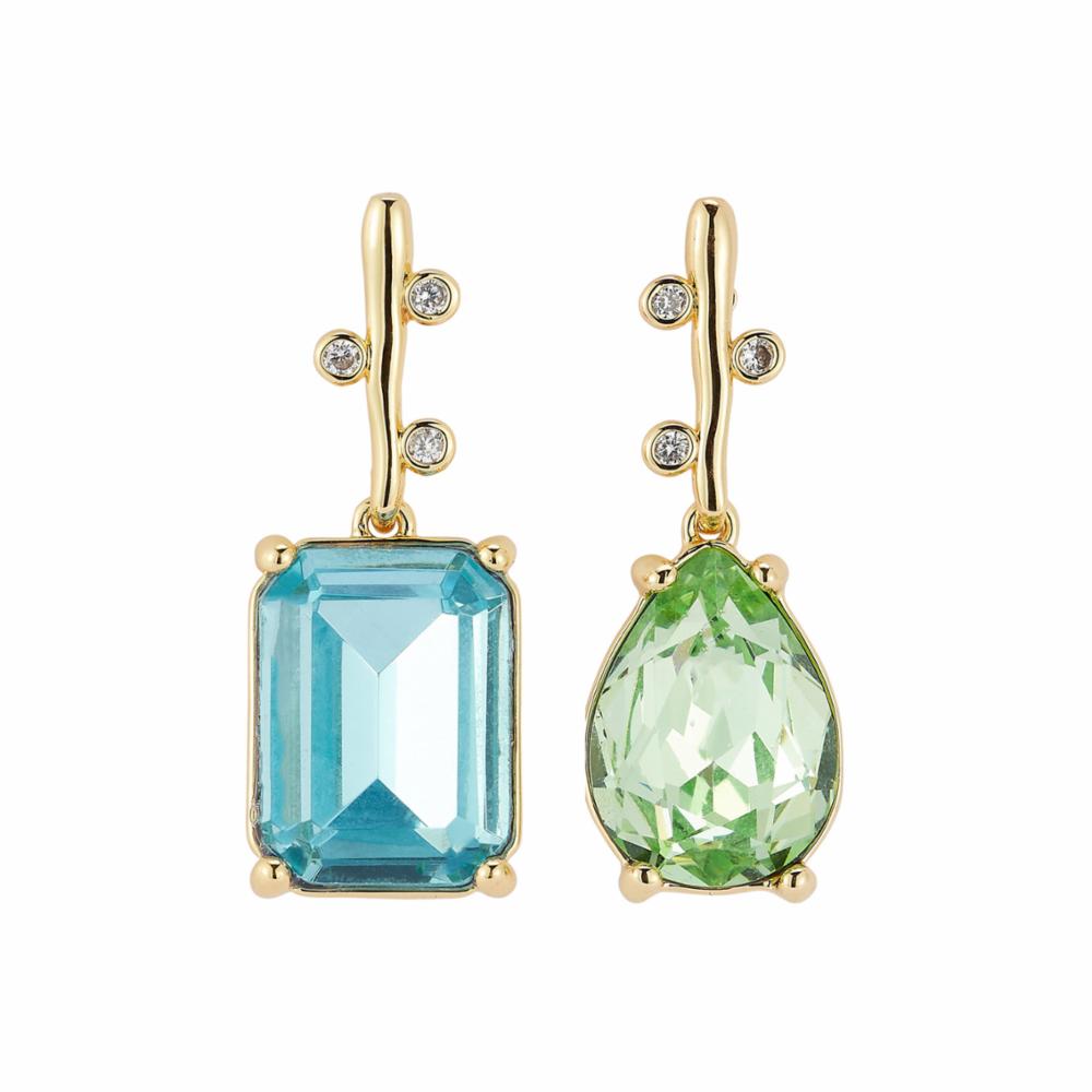 Make a striking statement with the Mignonne Gavigan Collins Earrings in Green Blue. Featuring a radiant blue emerald-cut crystal paired with a pear-shaped peridot-green crystal, these mismatched drops offer perfect balance and vibrant color contrast. Set in gold with sparkling accents, they add a unique and elegant touch to elevate any outfit.