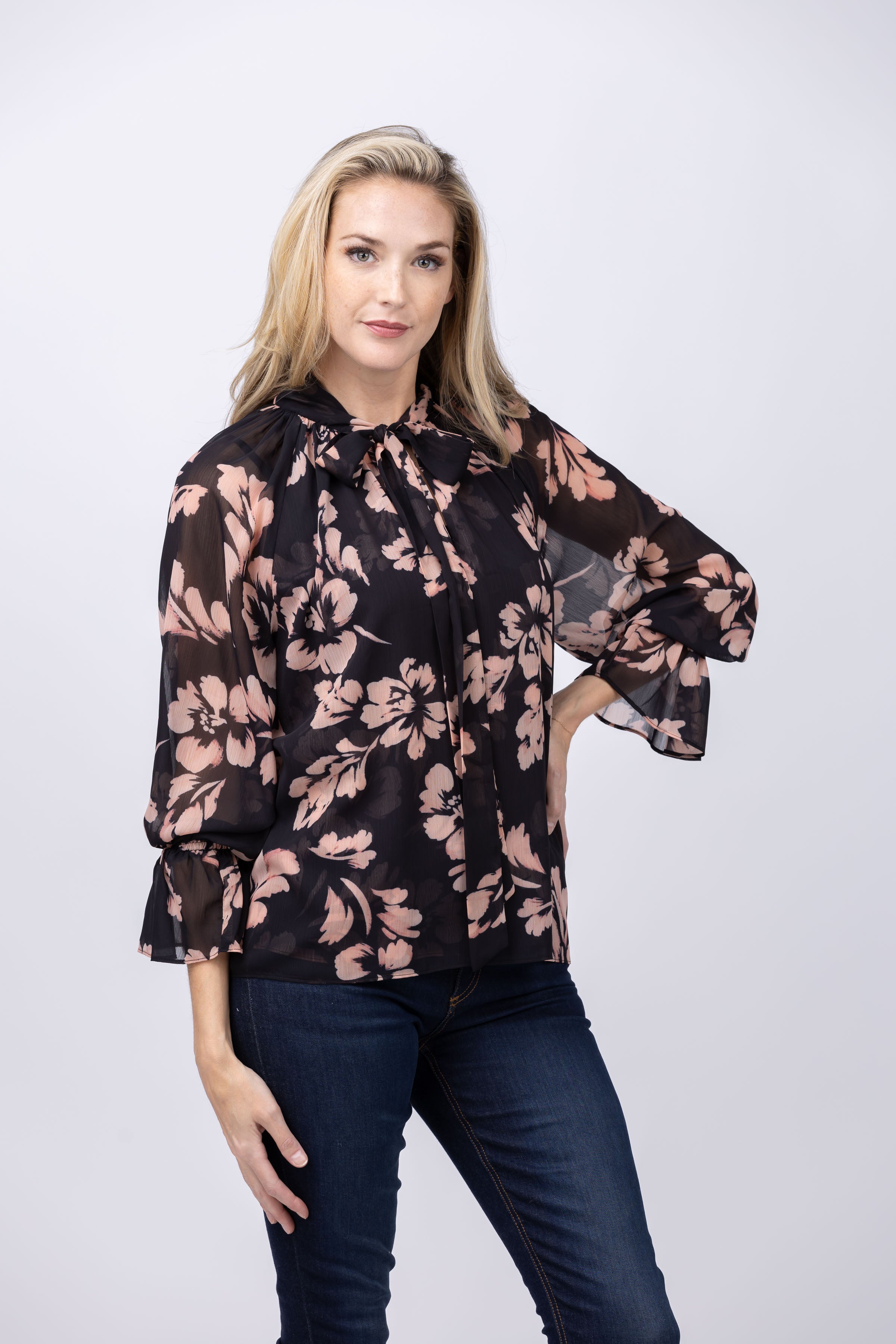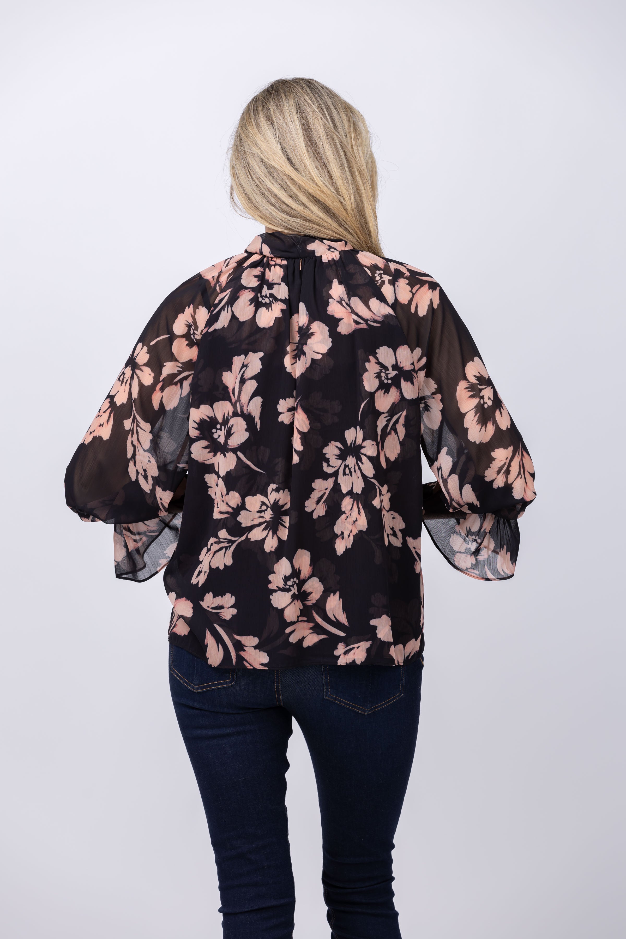 Unleash your effortless chic with the Misa Gracie Top In Auric Flora. Made from a semi-sheer printed chiffon, this top features long sleeves with a ruffle cuff and a high neckline with a neck-tie that can be styled loose or in a bow. Perfectly pairs with denim for an effortless look or with the coordinating Bar or Sierra skirt for a stylish set.