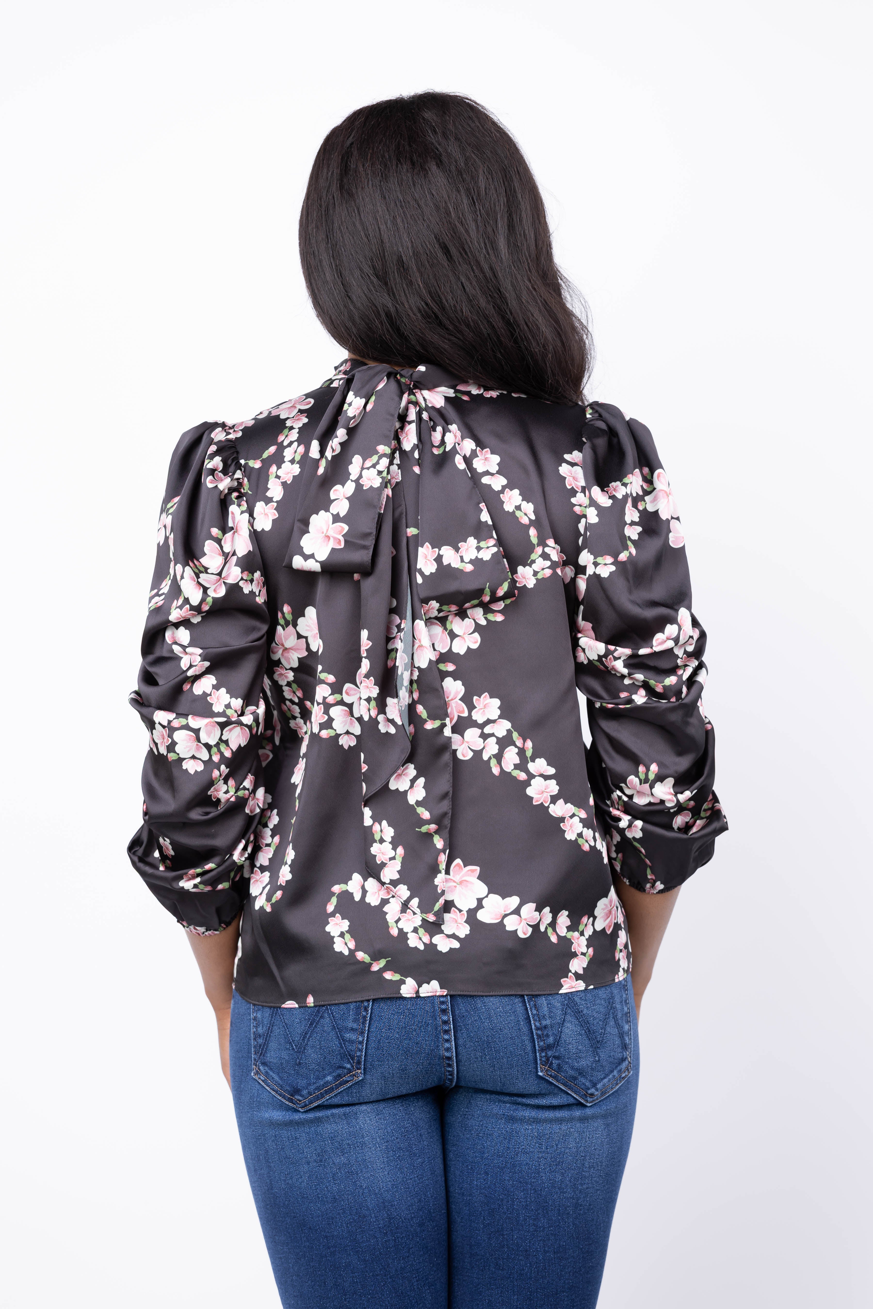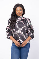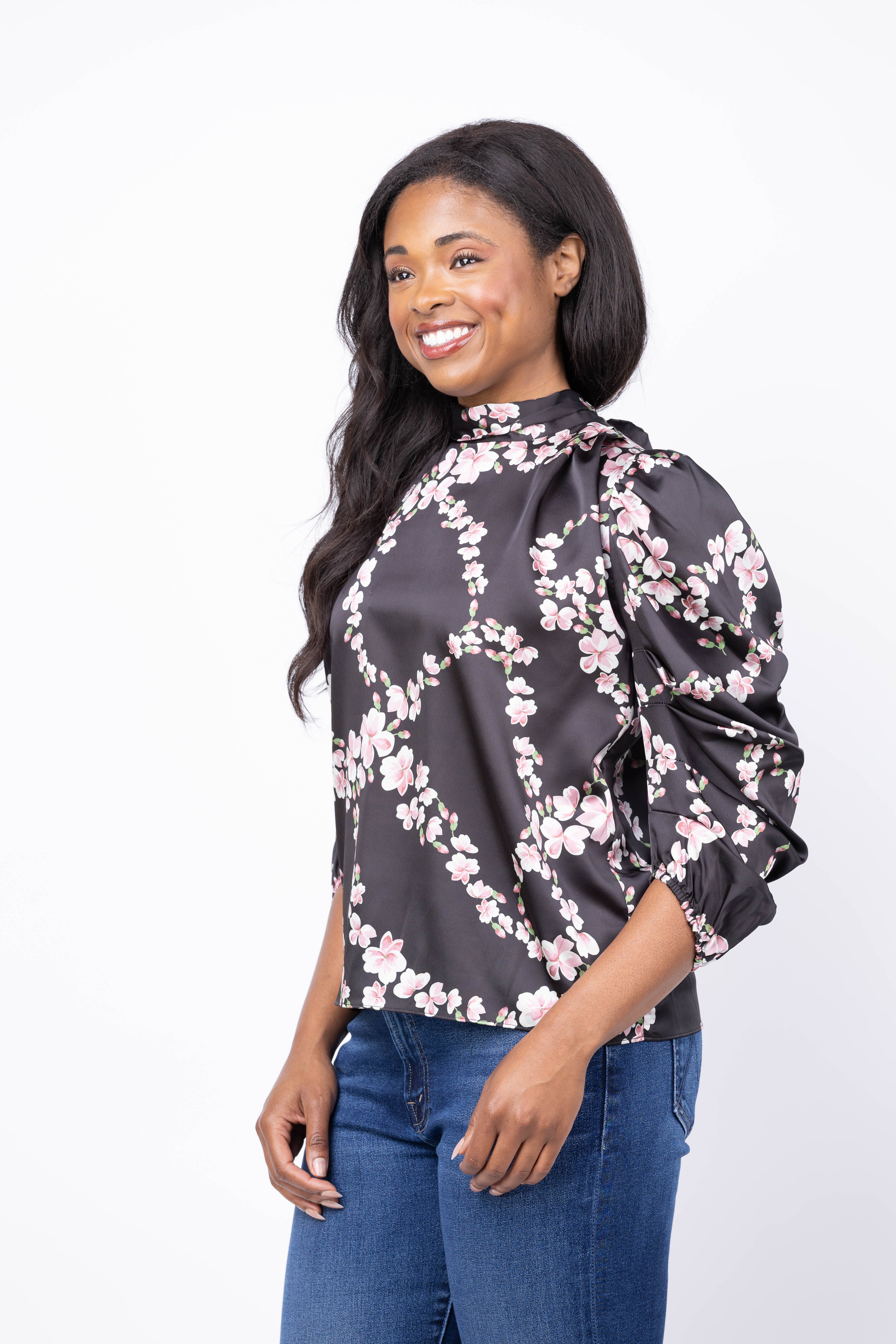 Elevate your wardrobe with the Luella Top, crafted from luxurious Chained Blossom printed satin that commands attention. The sophisticated high mock neckline with tie closure creates an instantly polished silhouette, while gathered shoulders and three-quarter ruched blouson sleeves deliver refined elegance with modern edge. Versatile enough to transition seamlessly from day to night—pair with the coordinating Shelley skirt for a cohesive statement look, style with tailored black trousers for professional polish, or keep it casual with your favorite jeans. This is the investment piece that effortlessly elevates any occasion.