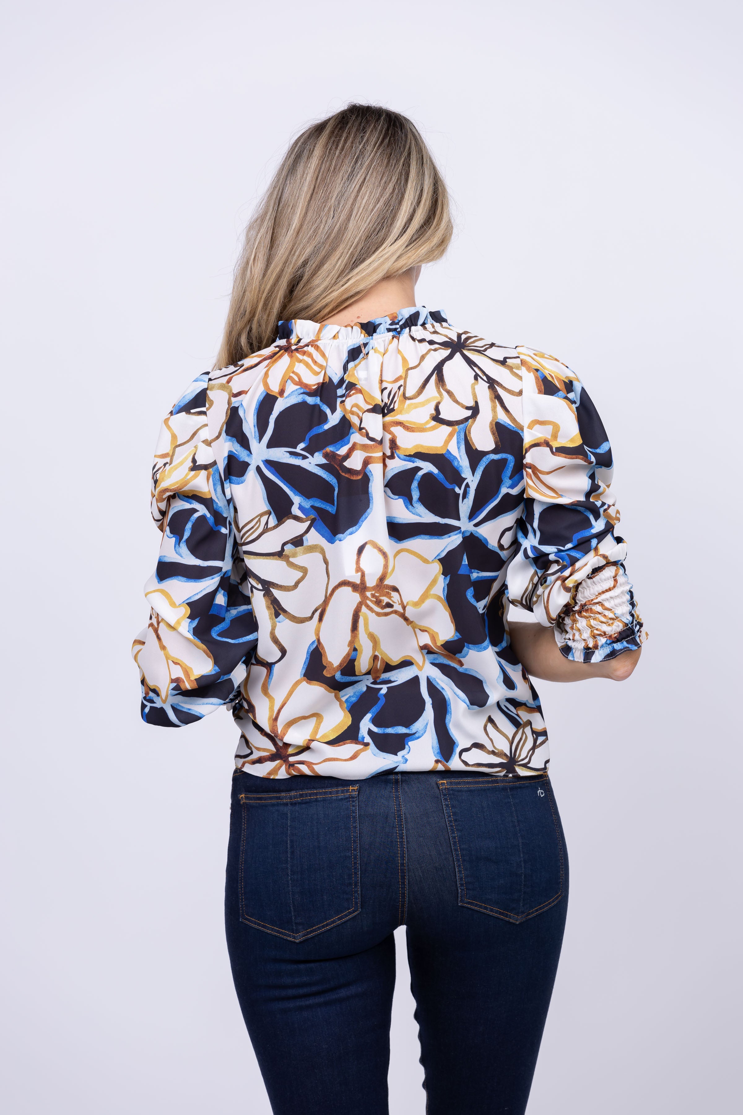 Revamp your wardrobe with the Misa Los Angeles Siena Top in Bold Blooms. Made with soft printed crepe, this bestselling top features a split-tie neckline, ruffle trim, and petal ties for a feminine touch. The long sleeves with smocked elastic cuffs add a stylish flair. Versatile for any occasion, pair it with jeans or trousers for a chic look.