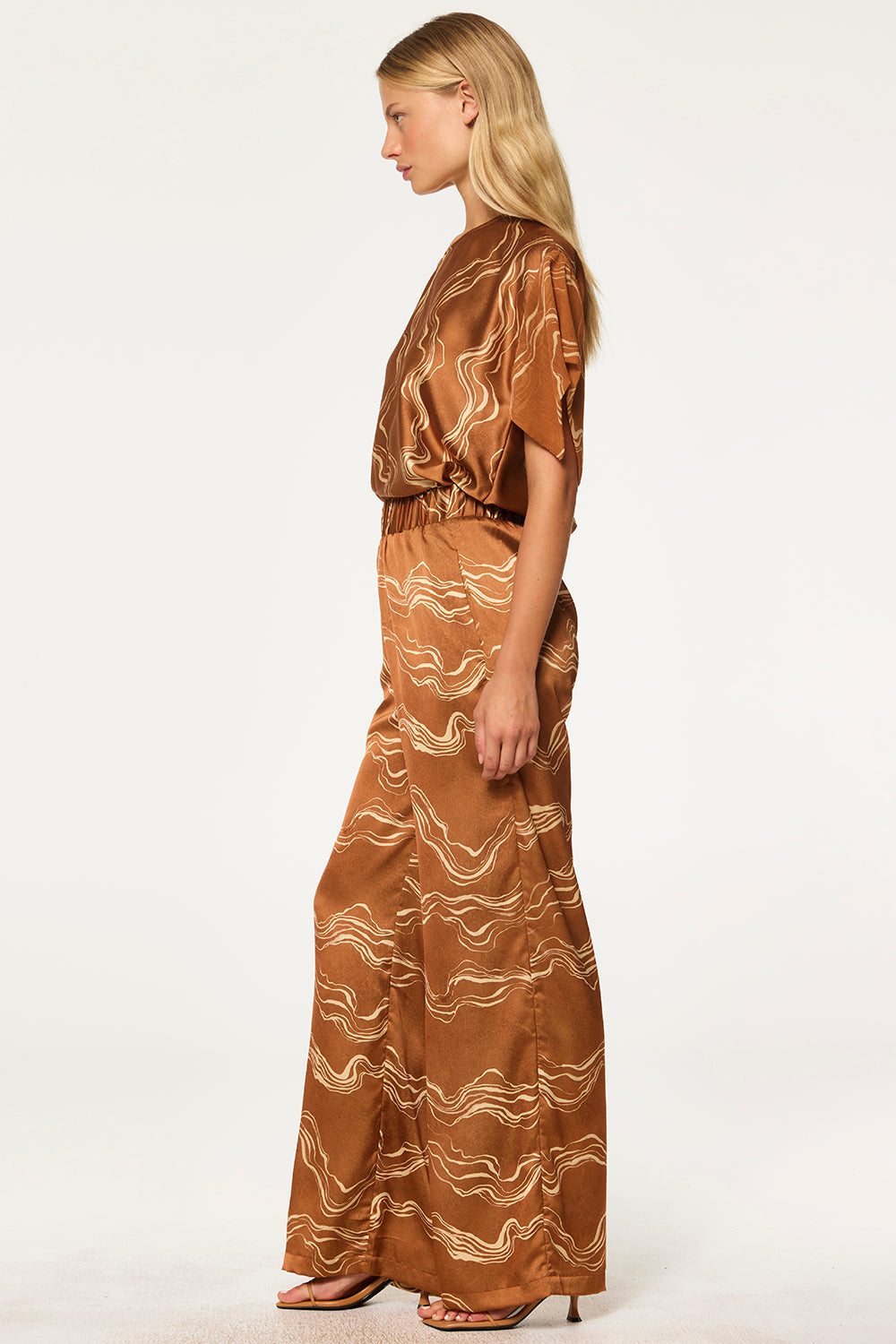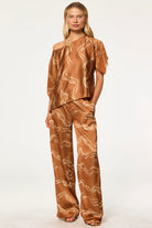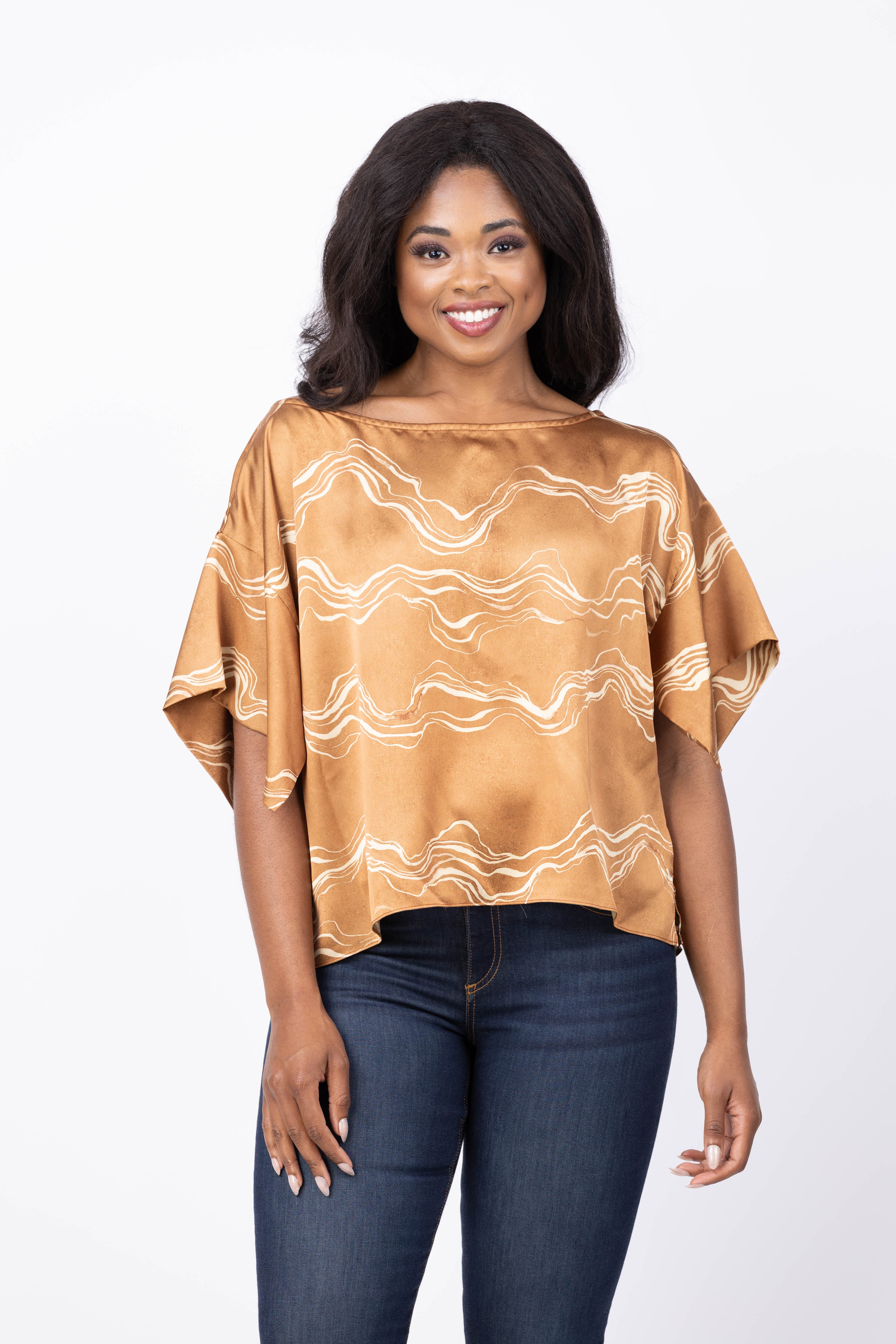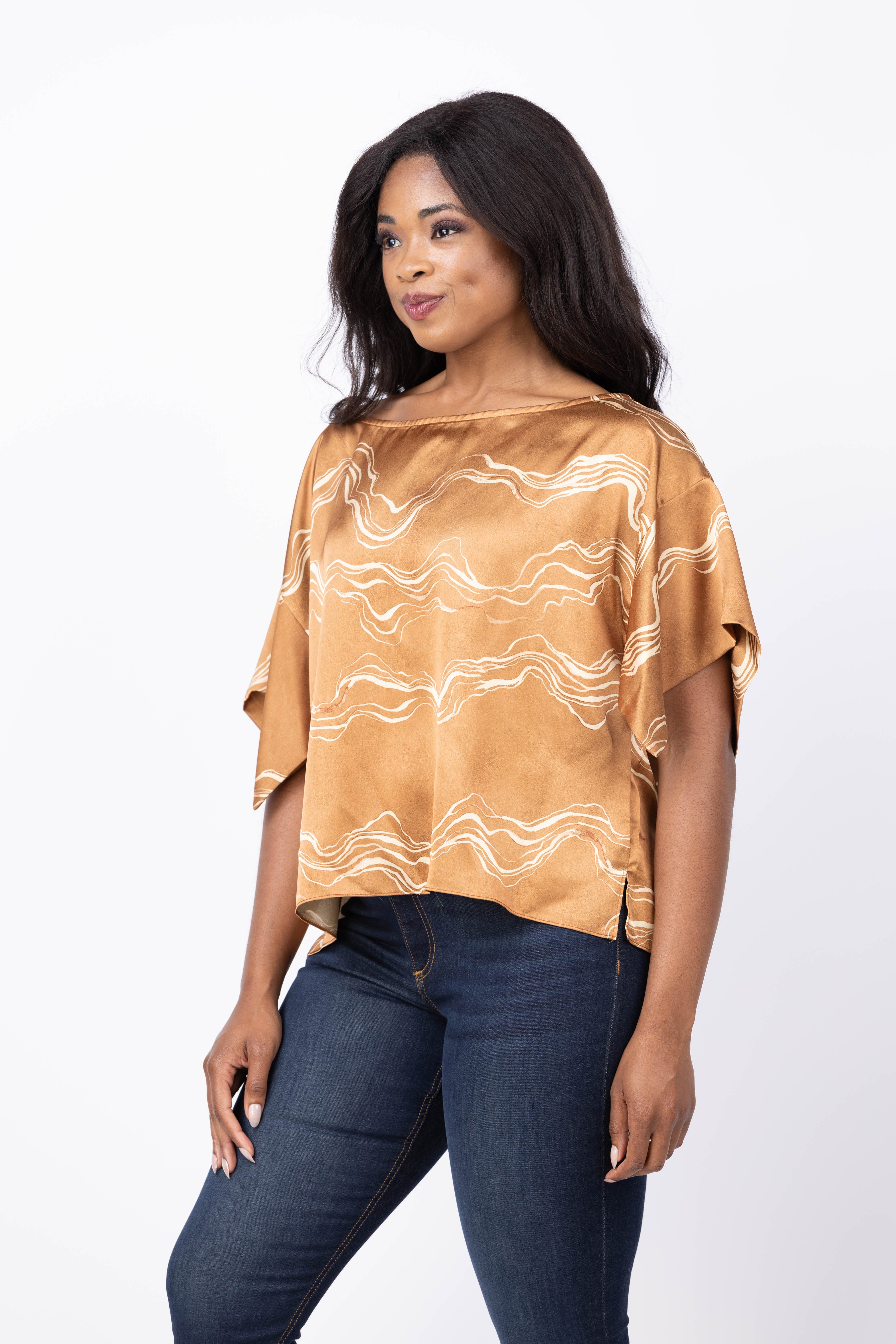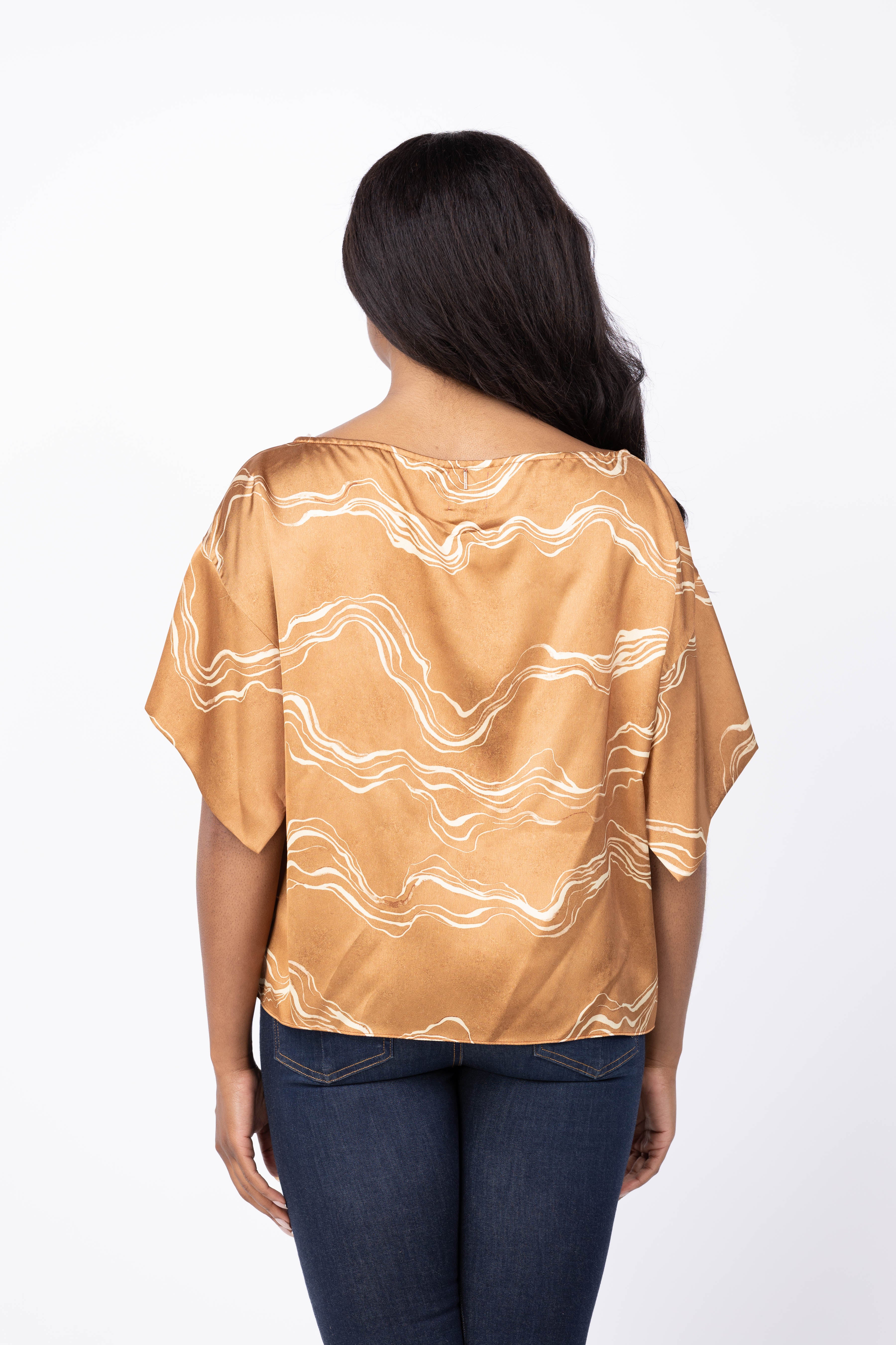 Elevate your everyday style with the Misa Los Angeles Telka Top in Linear Wave satin. This modern take on the oversized tee features a bateau neckline, roomy short sleeves, and subtle side and underarm slits for a relaxed yet refined silhouette. Wear it on or off the shoulder for an effortlessly chic, asymmetric look. Pair it with jeans for casual elegance or match with the Reshma pant to make a polished, coordinated statement. Perfect for those who value comfort without compromising on style.