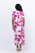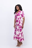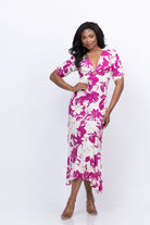 Discover the beauty and versatility of the Misa Los Angeles Wallis Dress. Made from our striking Fuchsia Flora linen, this midi dress features a flattering twist front bodice with a small cutout and a vibrant V neckline. The a-line silhouette, short puff sleeves, and handkerchief hem create a stunning look. Perfect for any occasion, dress it up with strappy heels or keep it casual with flats!