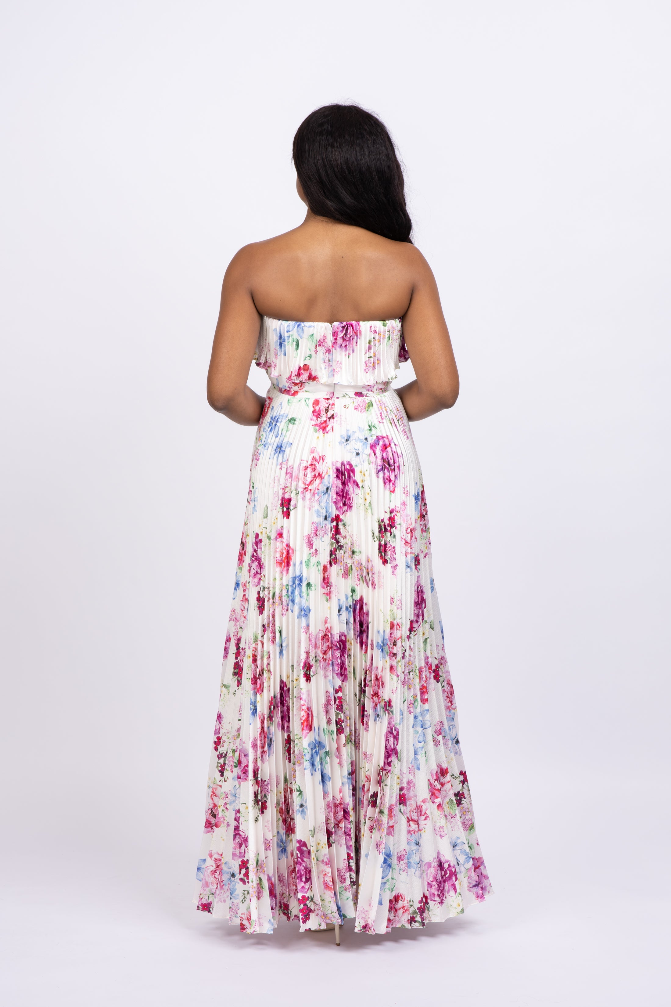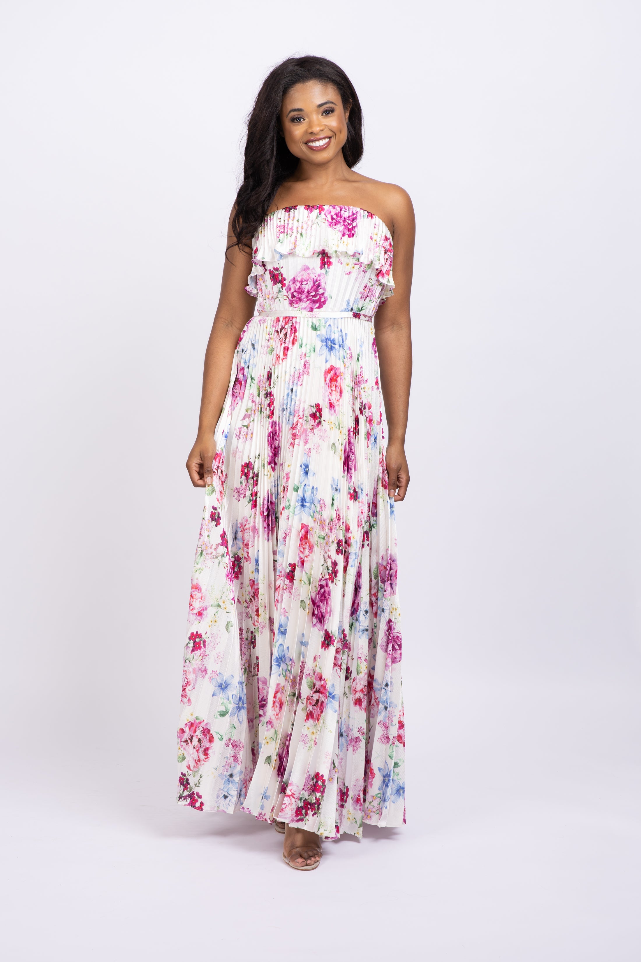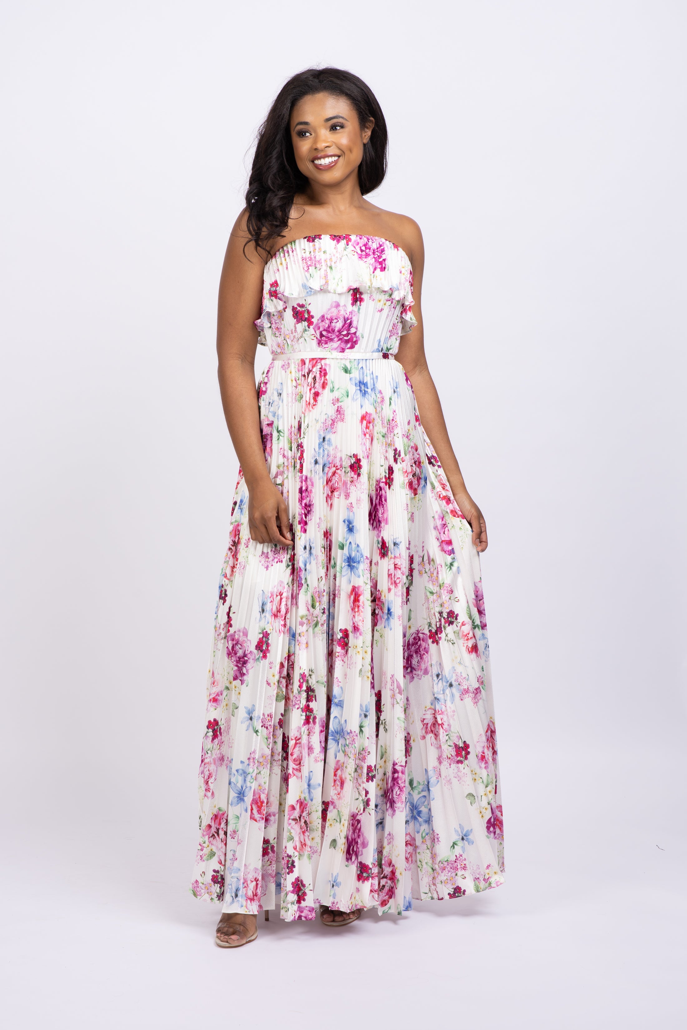 ML Monique Lhuillier's floral maxi dress is crafted of satin. Sharp pleats elevate this flowing style, showcasing a foldover strapless neck and a fish wire hem.