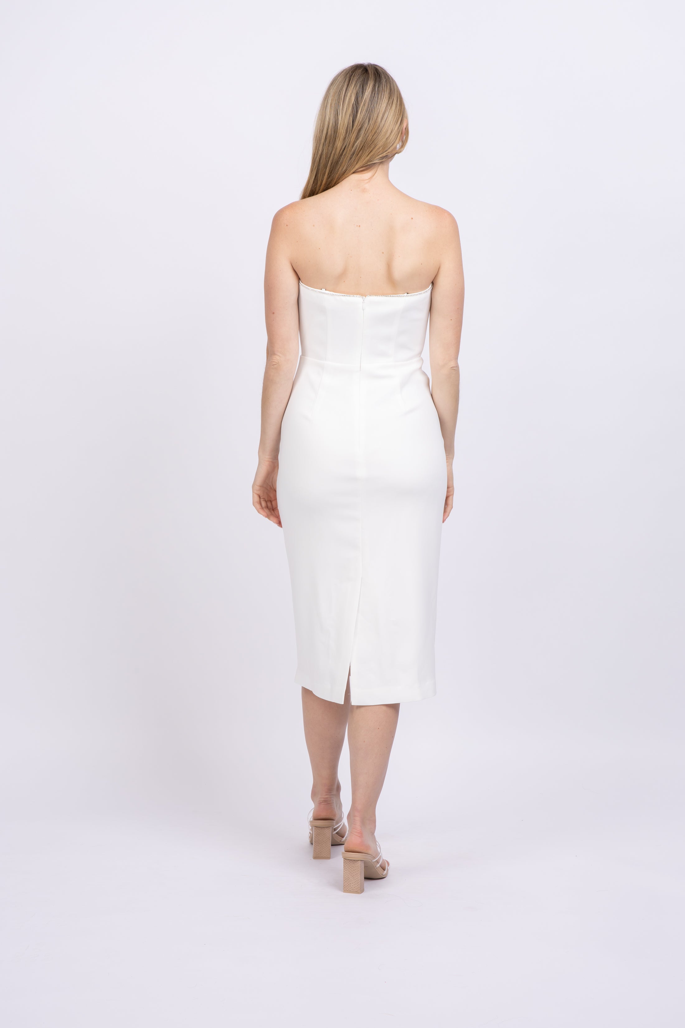 ML Monique Lhuillier's fitted midi-dress is crafted of stretch crepe. This fitted style flaunts a crystal-embellished strapless sweetheart neck.