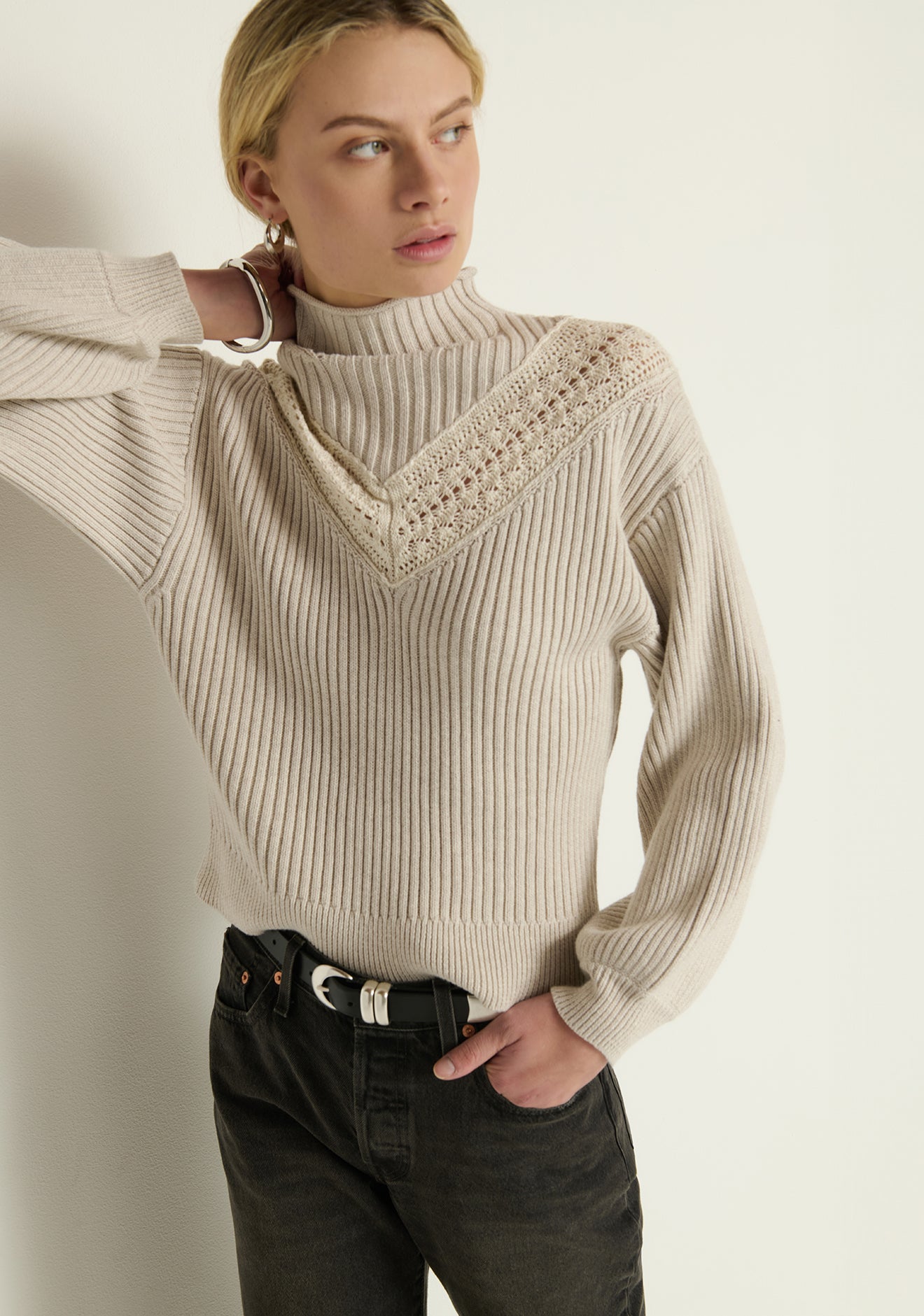 Elevate your sweater collection with the NATION LOS ANGELES Cassandra Mock Neck Pullover in Heather Oatmeal. Crafted from 100% Pima Cotton, it offers softness and breathability, while the wide ribbing adds a touch of sophistication. Unique crochet lace details bring a fresh twist to this classic long sleeve pullover, making it a standout piece for versatile styling. Comfortable and chic, this pullover effortlessly combines quality and design to enhance your everyday wardrobe.