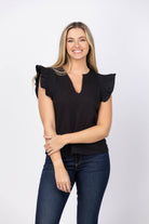 Elevate your wardrobe with the NATION LTD Christa Ruffle Sleeve Top in Jet Black. Crafted from structured Heavy Slub fabric, this timeless piece features delicate flutter sleeves and a subtle keyhole neckline, offering both comfort and sophisticated style. Its classic silhouette in a versatile black shade makes it perfect for effortless day-to-night looks.