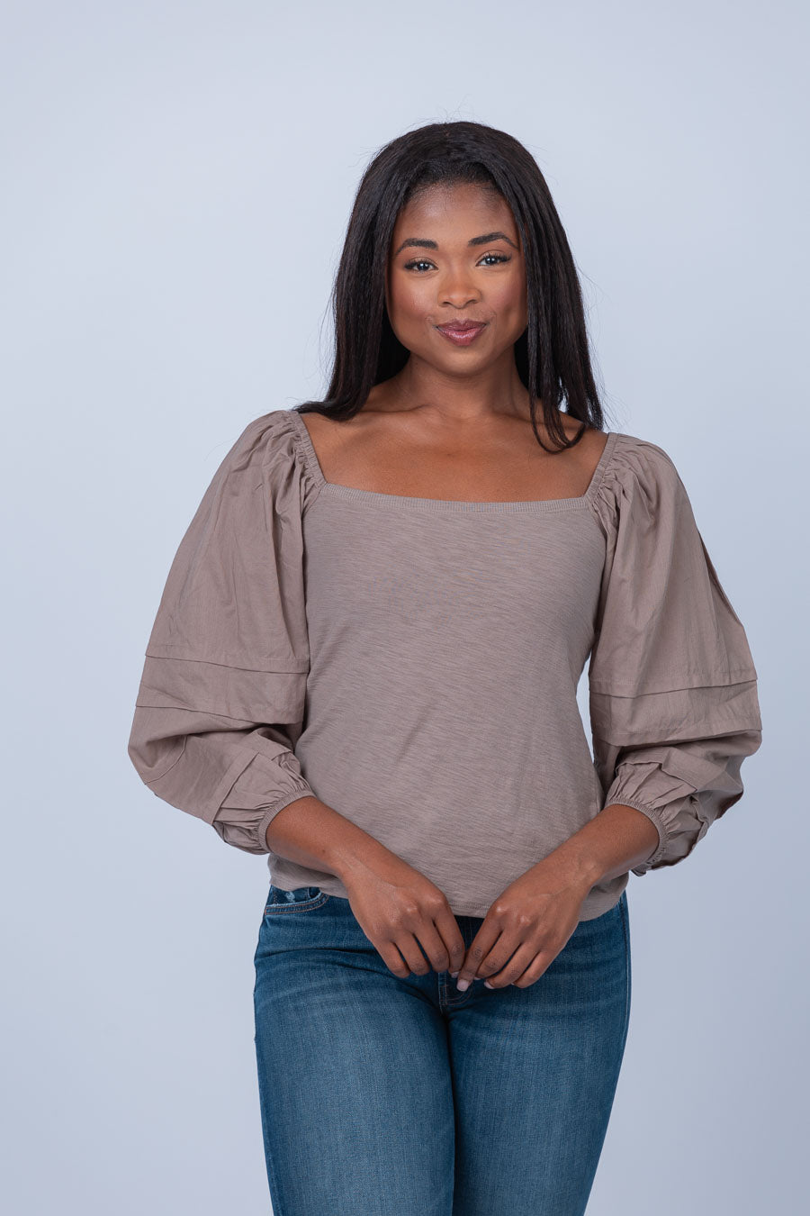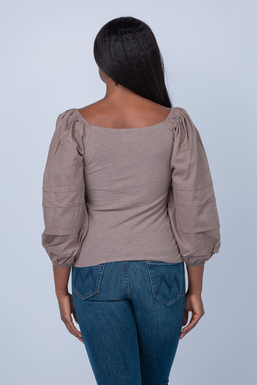 Introducing the Nation Ltd Emmeline Pintucked Top in Granite. This exquisite top features a romantic combination of a square neckline, contrast poplin balloon sleeves with pintuck details, and a ribbed-knit bodice for unmatched comfort and style. Look and feel your best all day long!