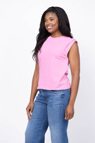 Elevate your casual wardrobe with the NATION LTD Marina Muscle Tee in Dahlia. Crafted from soft cotton jersey, this tee offers a relaxed fit and a flattering crew neckline for effortless style. Featuring our signature snap closure and a unique shoulder detail, it adds just the right amount of edge to your everyday look. Perfect for those who want comfort without compromising on flair.
