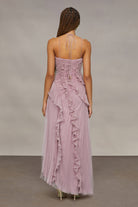 Drift into elegance with the AMUR Lorelie Halter Gown, a mesmerizing piece in dreamy dusty lilac that celebrates fluid grace. Lily pad-inspired pleating adorns the bodice with architectural precision, while cascading ruffles flow downward like gentle water currents, creating movement with every step. The halter neckline offers sophisticated support, making this gown perfect for those seeking a statement piece that balances artistic design with wearable comfort. Whether you're attending a special event or making an unforgettable entrance, this gown transforms you into a vision of ethereal beauty.