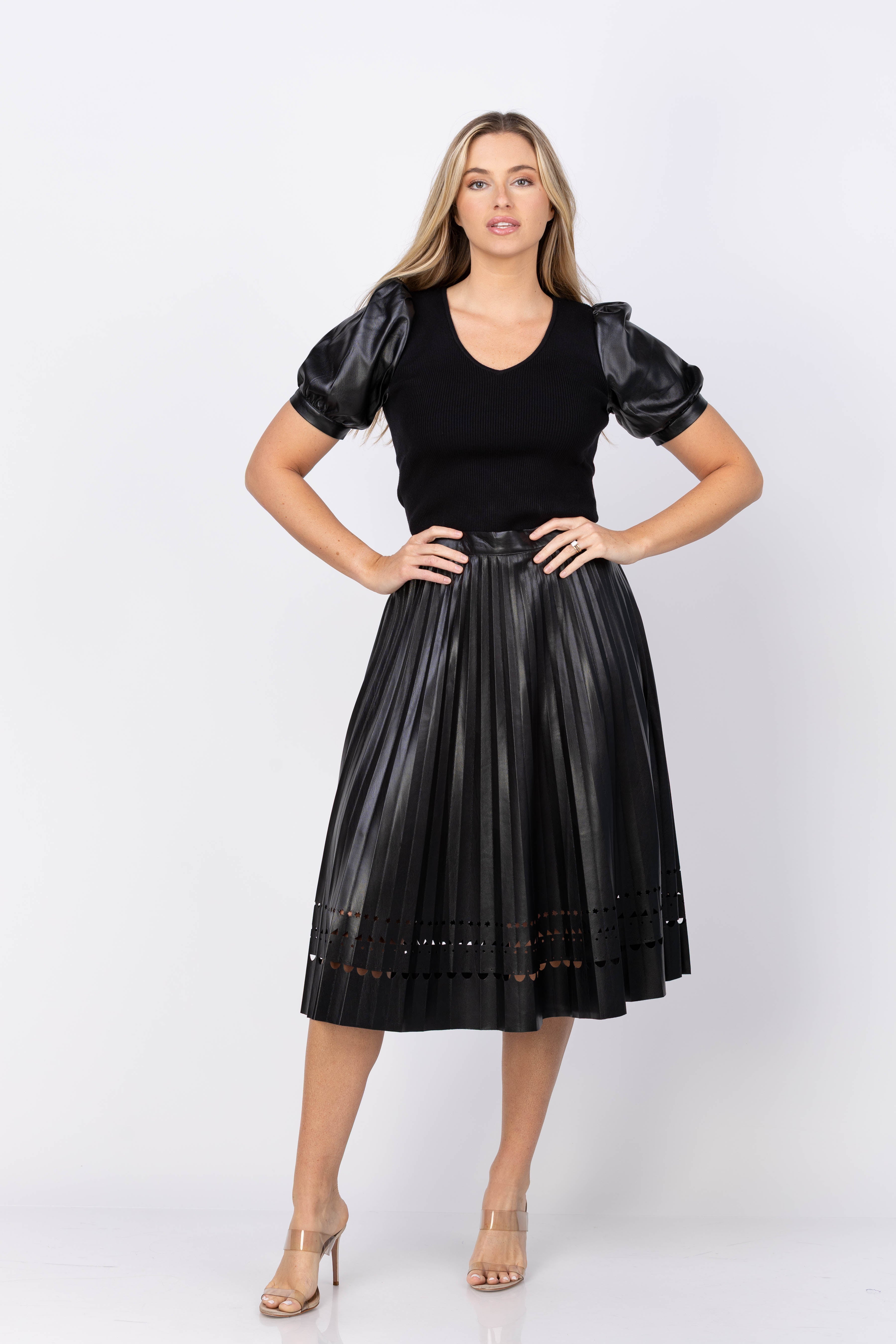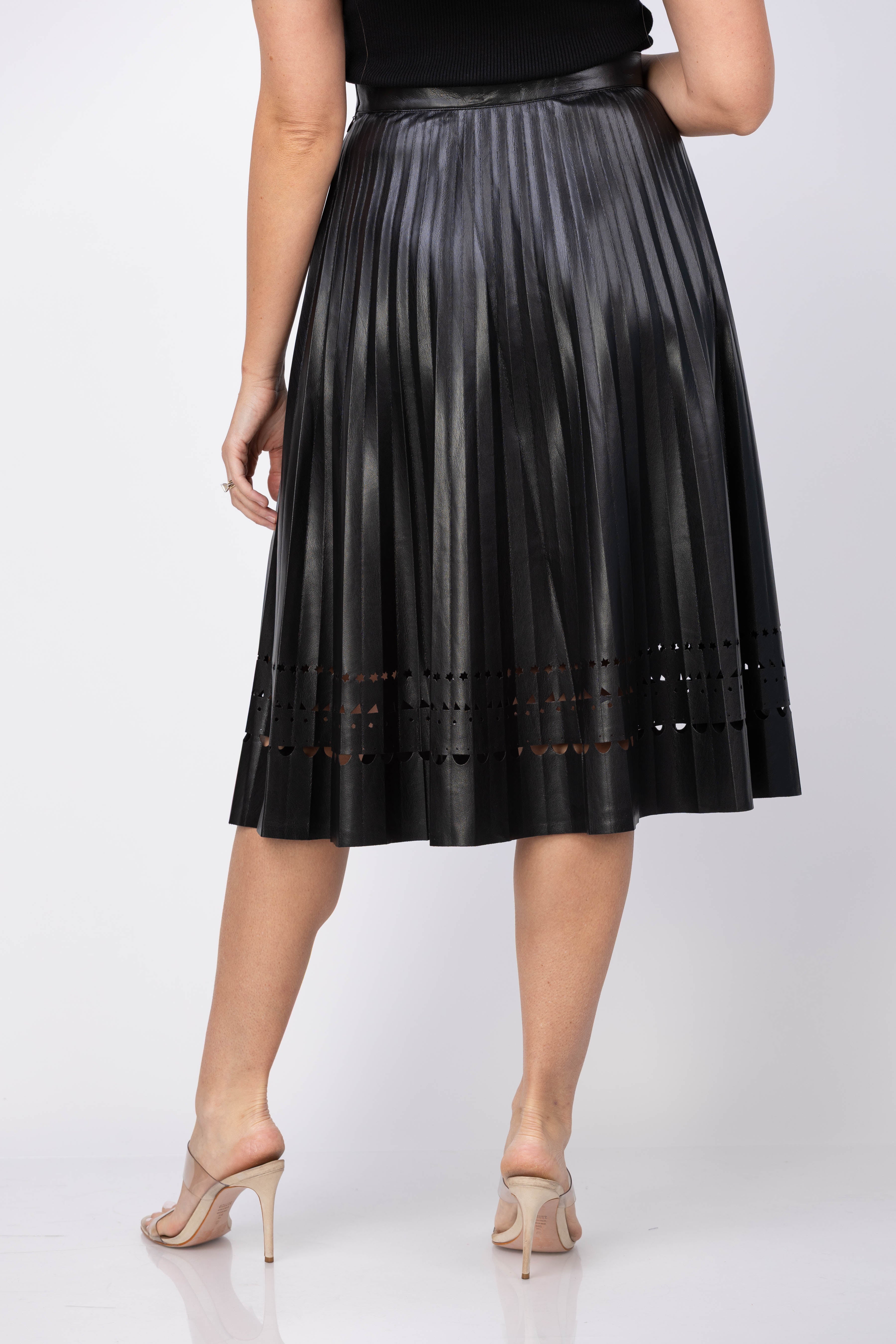 The Alana Skirt from the Caballero Collection redefines the classic pleated silhouette with sharp, structured pleats that bring dynamic movement and texture. Crafted from black vegan leather, this midi-length skirt features a flattering waistband and intricate laser-cut detailing along the hem, adding a bold yet refined touch. Perfectly suited for both work and evening, the Alana Skirt offers versatile sophistication that elevates any outfit.