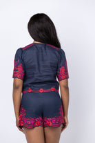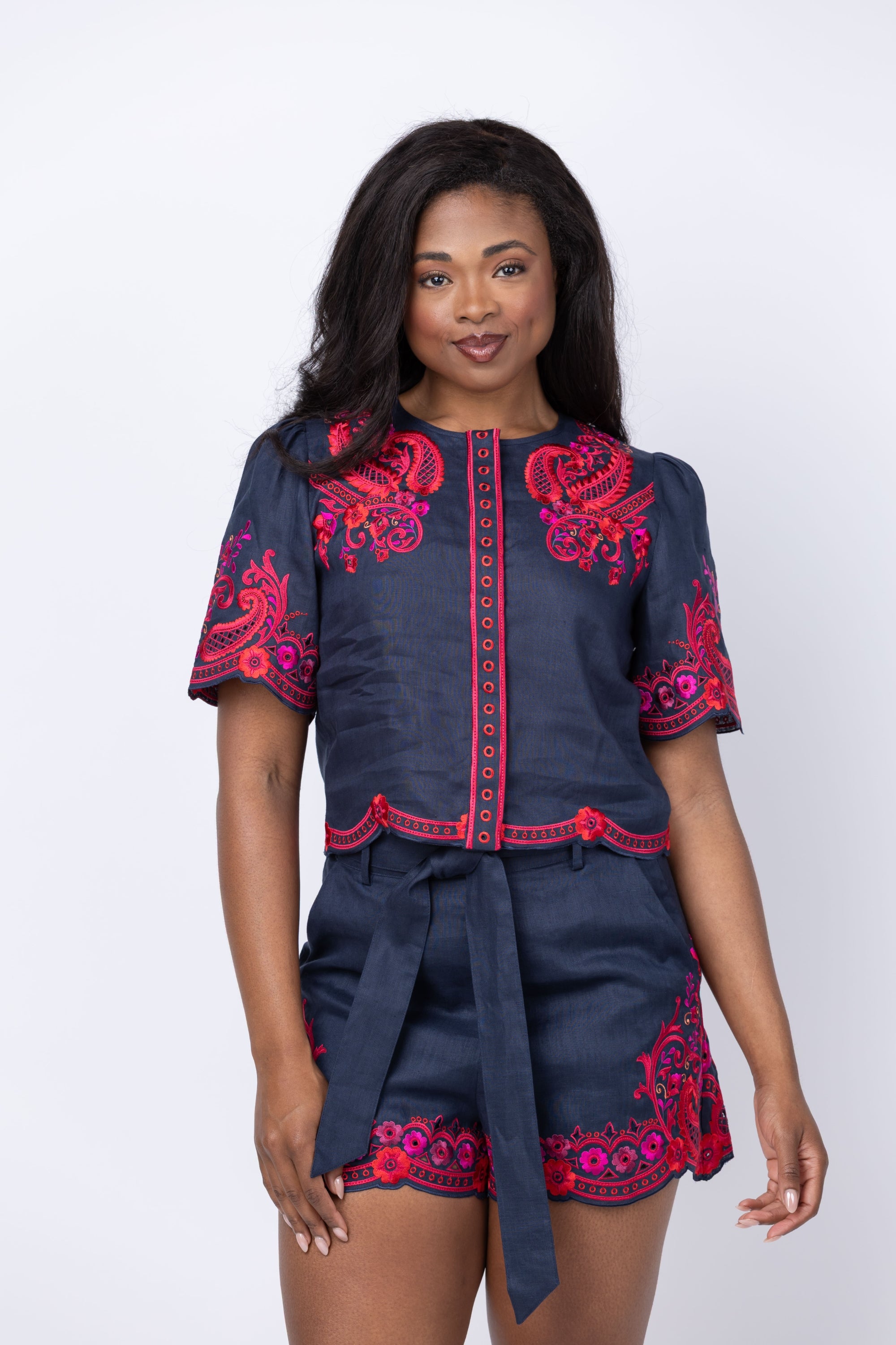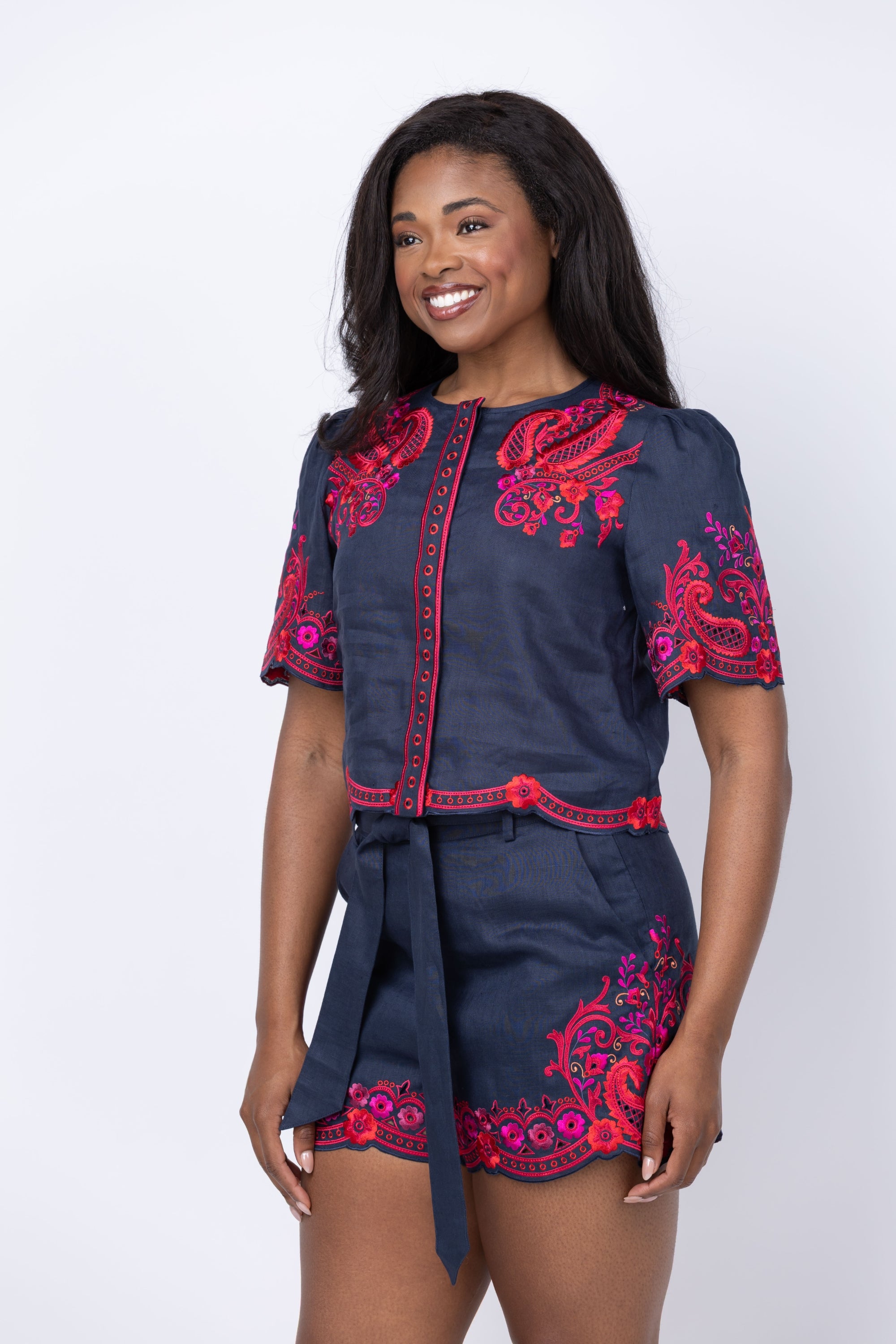 The Jane Top in Midnight Rosaria transforms everyday wear into wearable art. Crafted from breathable pure linen, this top features exquisite paisley floral embroidery that flows from functional pockets to a delicate scalloped hem—a hallmark of Christy Lynn's meticulous design philosophy. Whether paired with the coordinating Benny Shorts or worn as a standalone piece, the Benny delivers effortless sophistication with an undeniable touch of artisanal elegance.