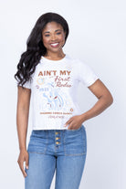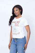Introducing the Bespoke Aint My First Rodeo Shrunken Tee, the perfect stylish tee for everyday wear. You'll love the vibrant print and stitch details on the front, combined with a comfy crew neckline. A must-have addition to any wardrobe.