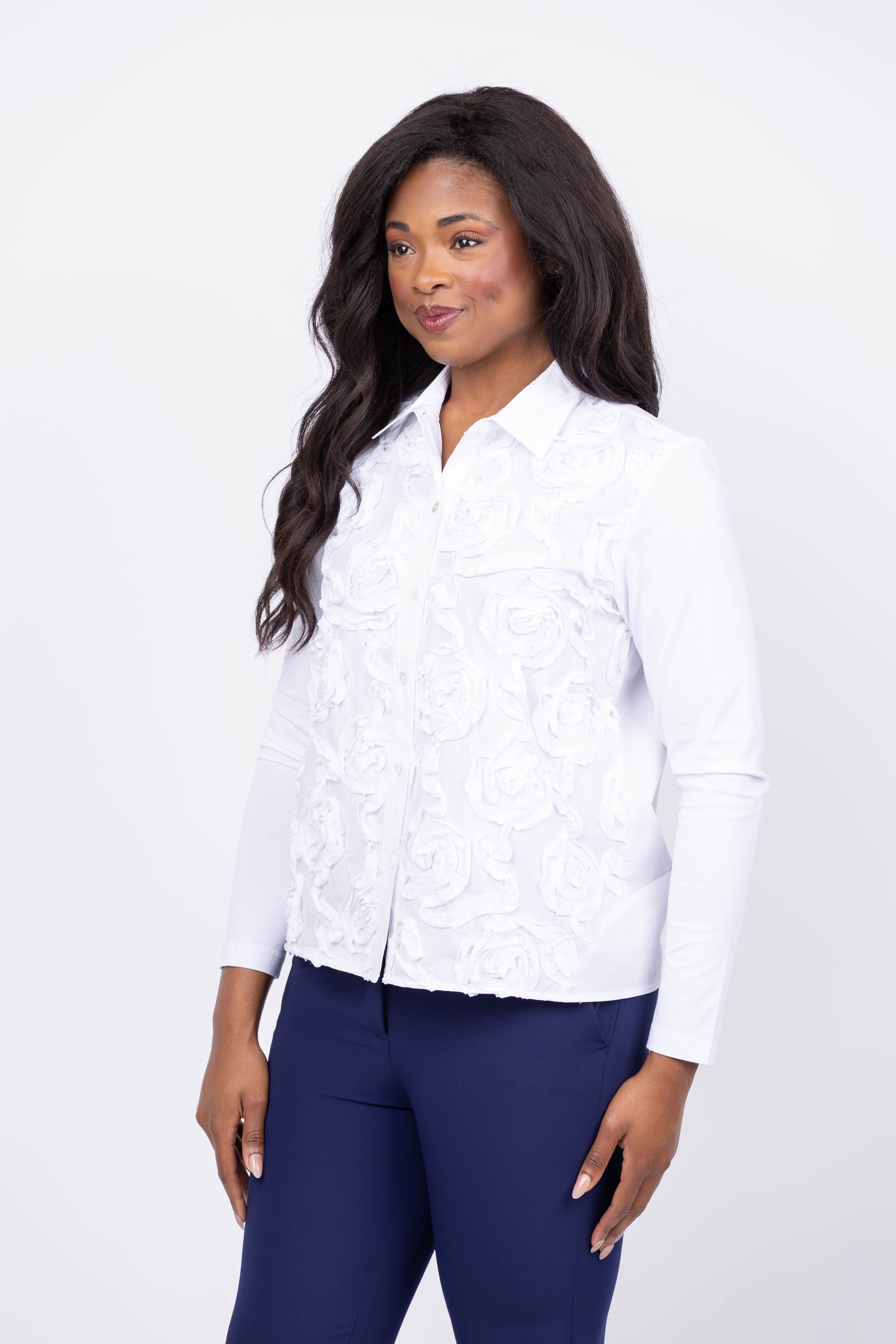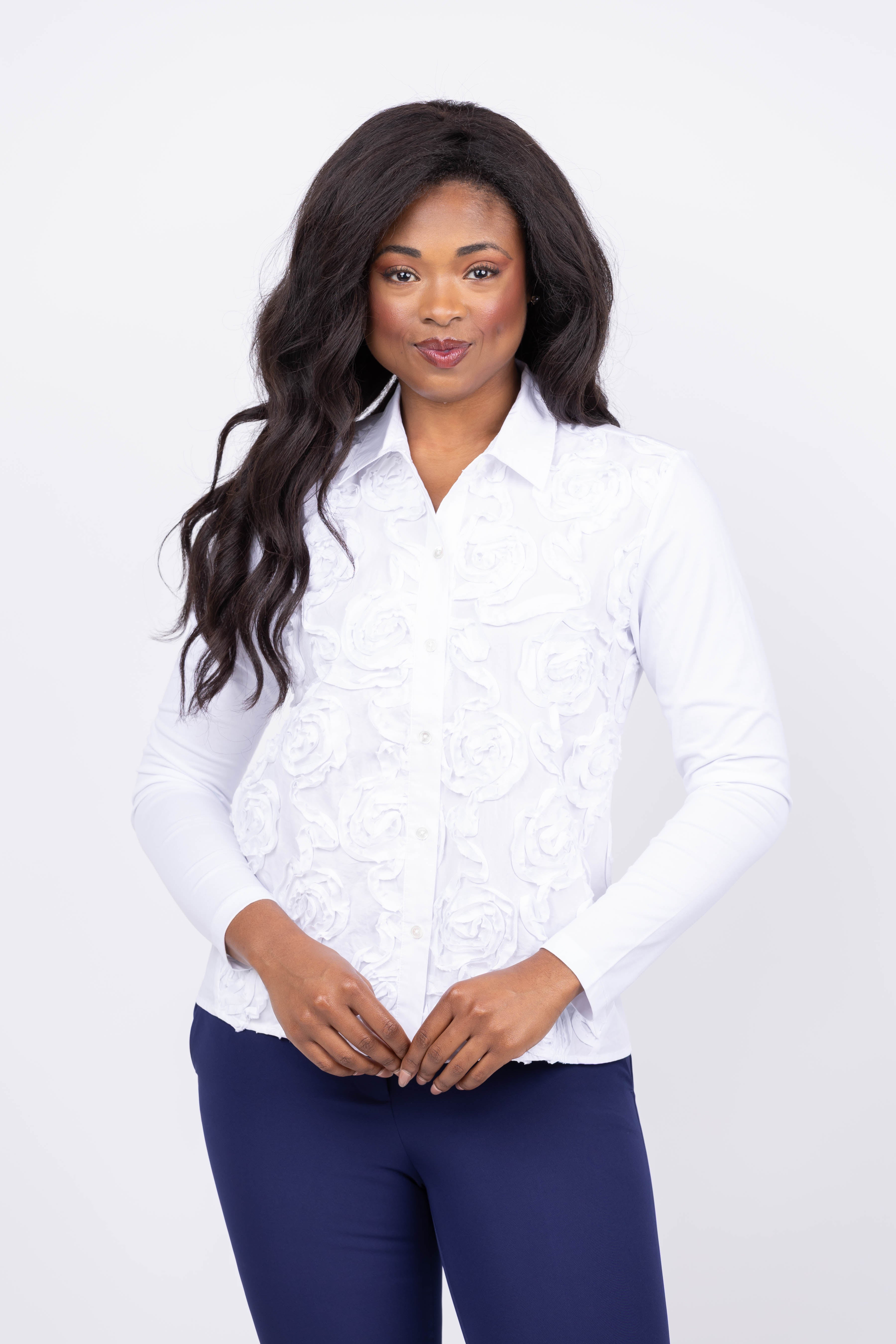 Elevate your wardrobe with the Elliott Lauren Flower Textured Top in White. This elegant blouse features delicate floral detailing that adds a touch of femininity and sophistication. Its lightweight fabric ensures comfort throughout the day, making it perfect for both professional settings and casual outings. Pair it effortlessly with your favorite skirt or trousers for a fresh, polished look that stands out.