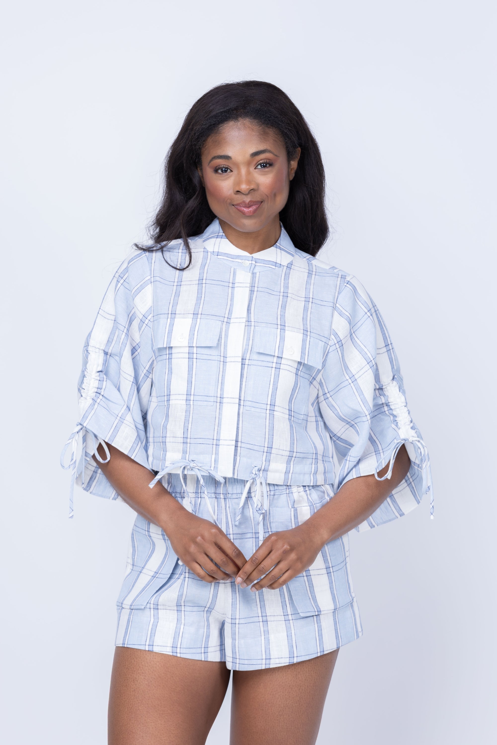 Crafted from our signature 100% linen, the Eva crop shirt combines effortless style with functional design. A button-front closure and relaxed band collar create a laid-back silhouette, while cargo-inspired front pockets add practical flair. Dropped, voluminous sleeves and adjustable drawstring ties let you customize the fit to your preference. Perfect for warm-weather layering or standalone wear.