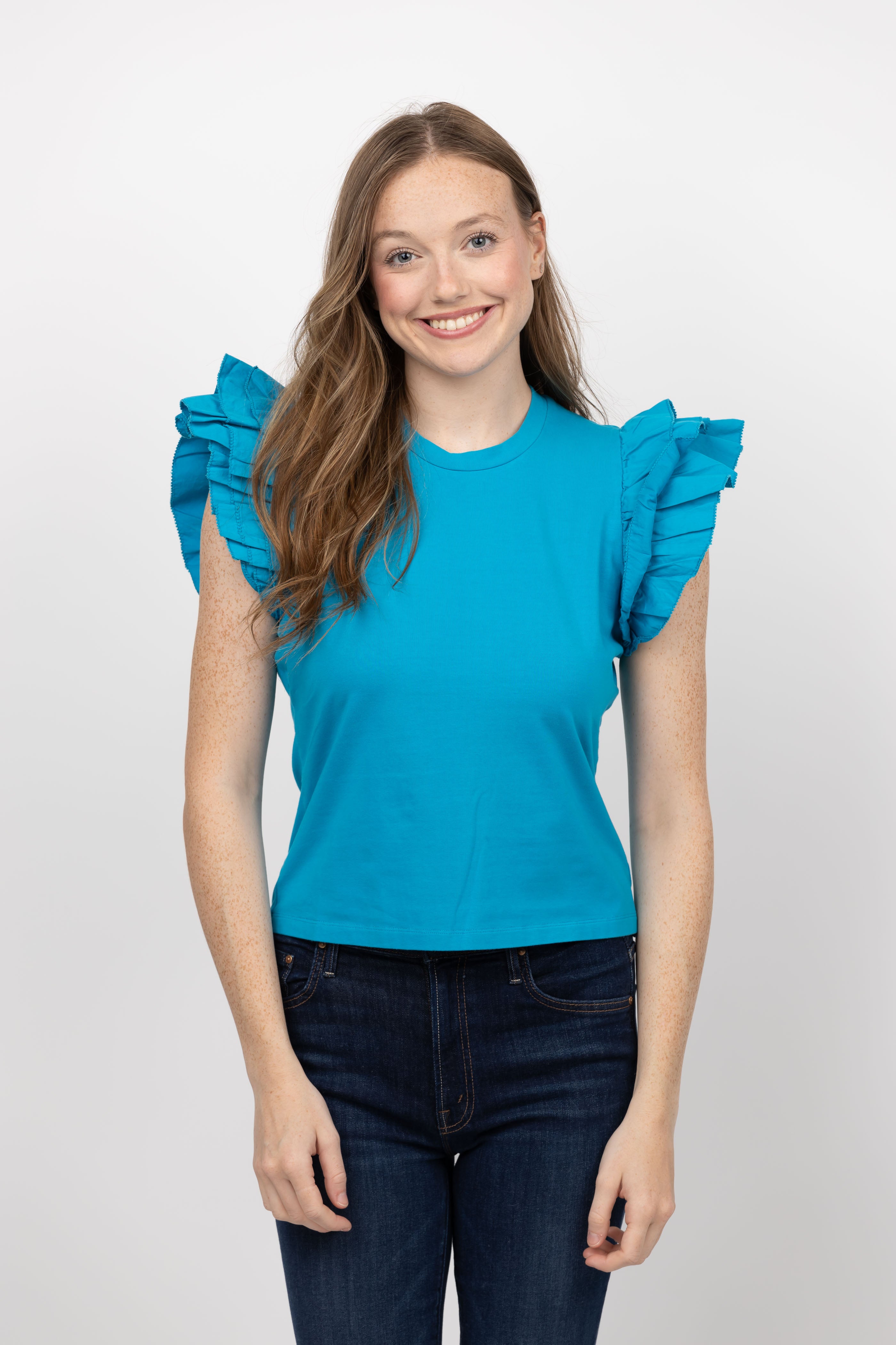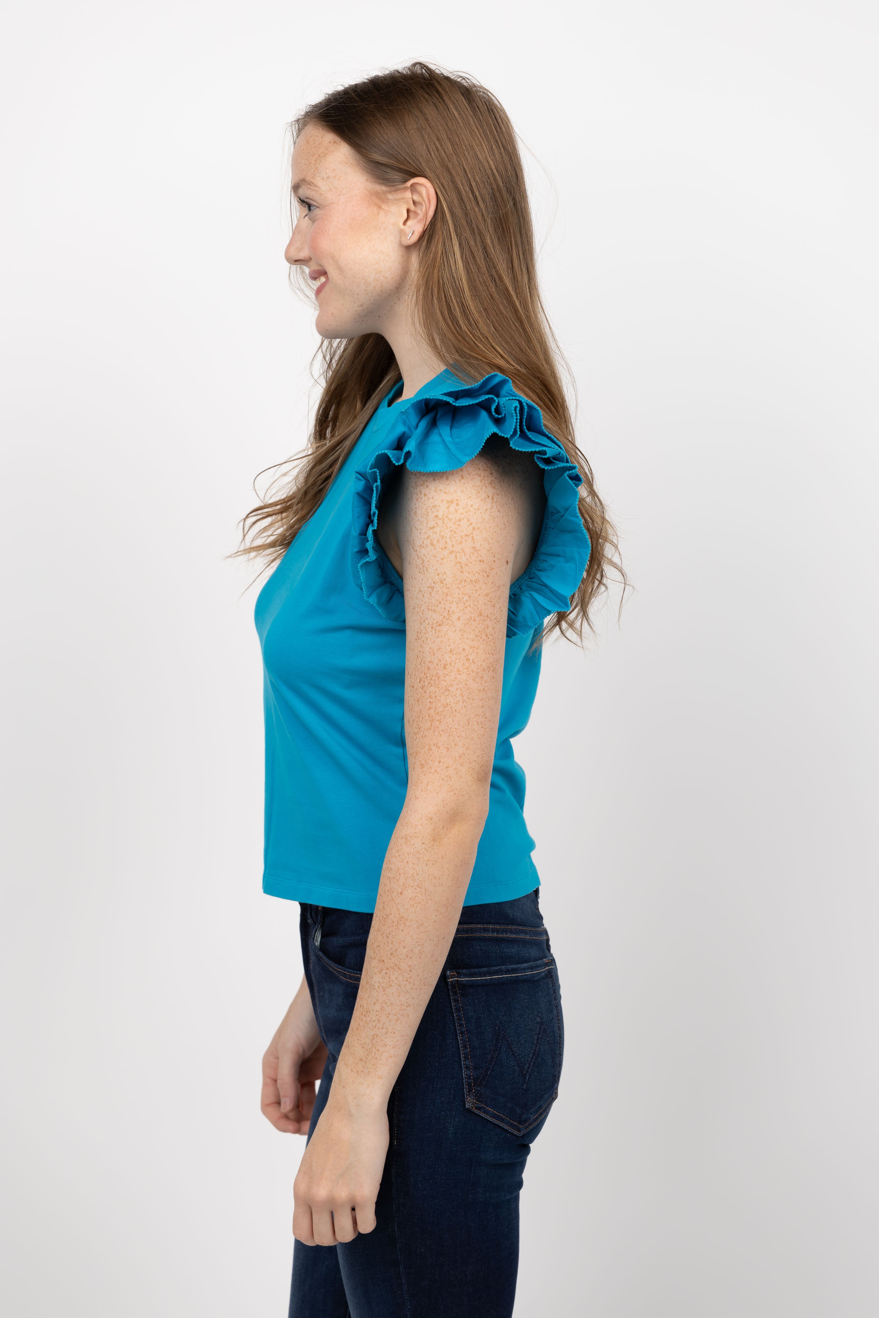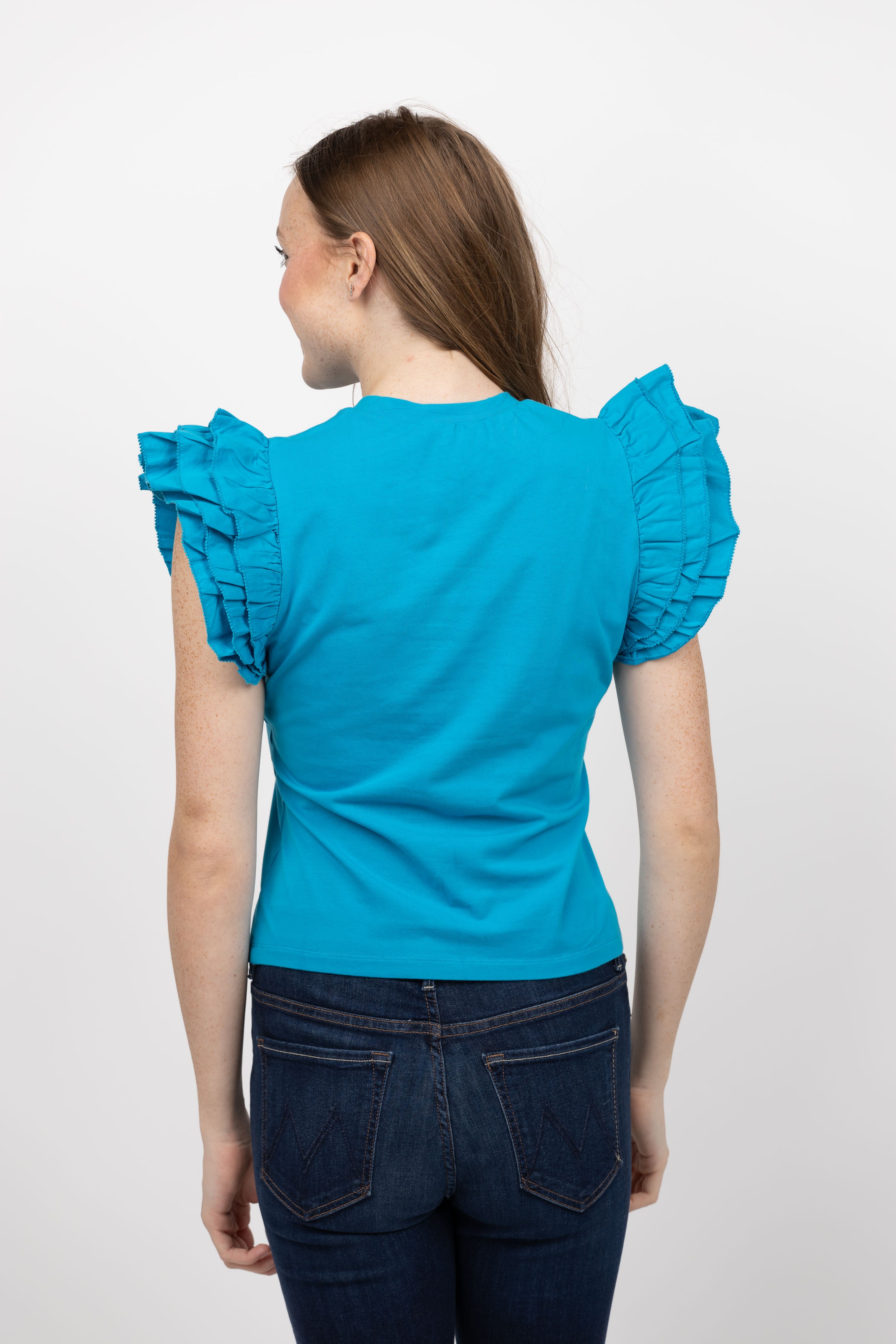 Fall in love with our Love The Label Jansa Tee in Caneel Blue! Made from 100% cotton, this top is soft and comfortable. The stylish ruffle sleeves add a touch of elegance, making it perfect for any occasion. Dress it up or down, this top offers effortless versatility and runs true-to-size.