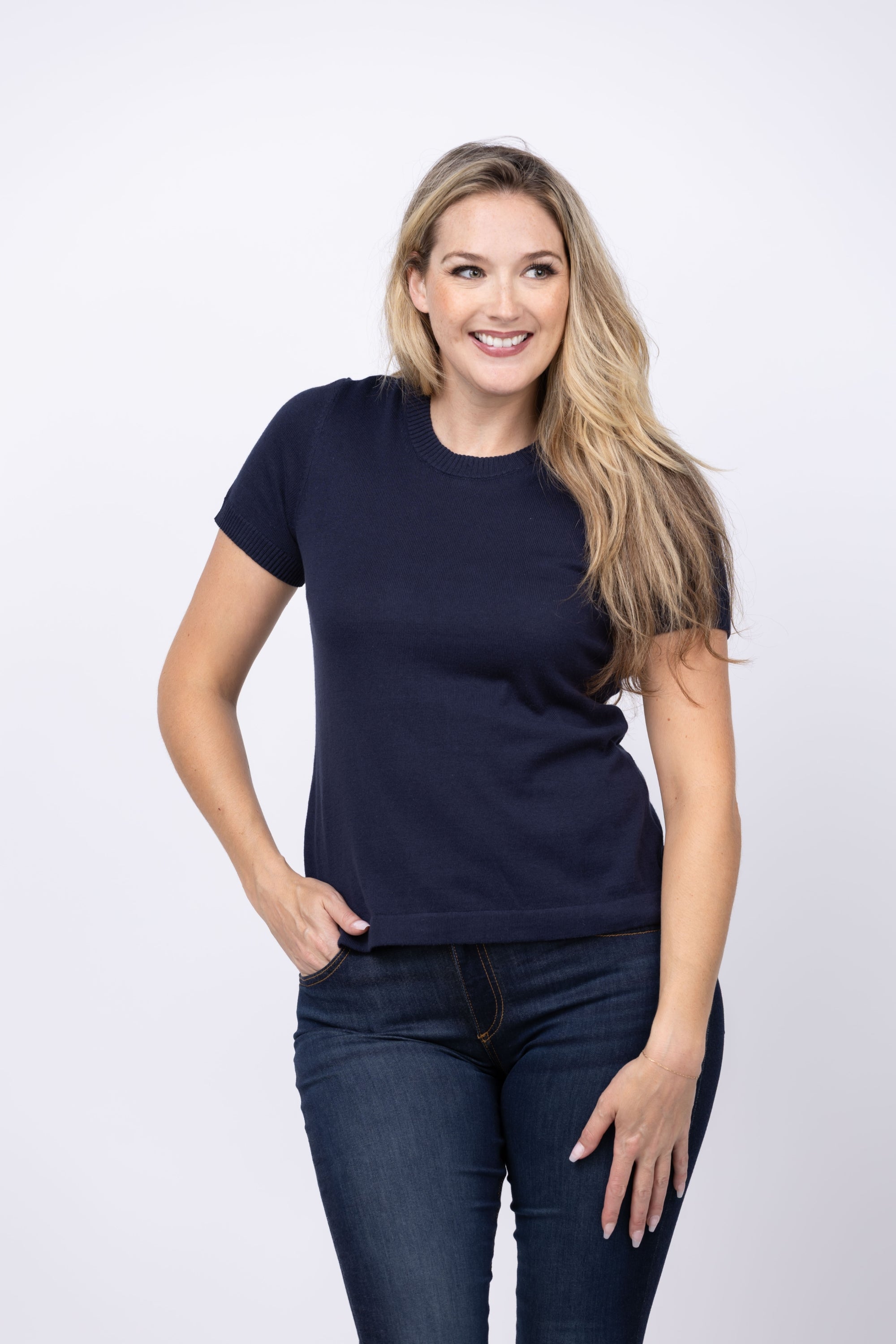 The Nic + Zoe Easy Scoop Neck Pure Cotton Sweater Tee in Dark Indigo perfectly blends elegant simplicity with effortless comfort. Crafted from 100% pure cotton using a mindful no-waste knitwear process, it’s gentle on both your skin and the planet. This versatile piece pairs beautifully with dressy work pants or your favorite denim, making it a sustainable and stylish essential for any wardrobe.