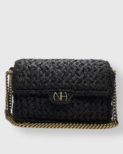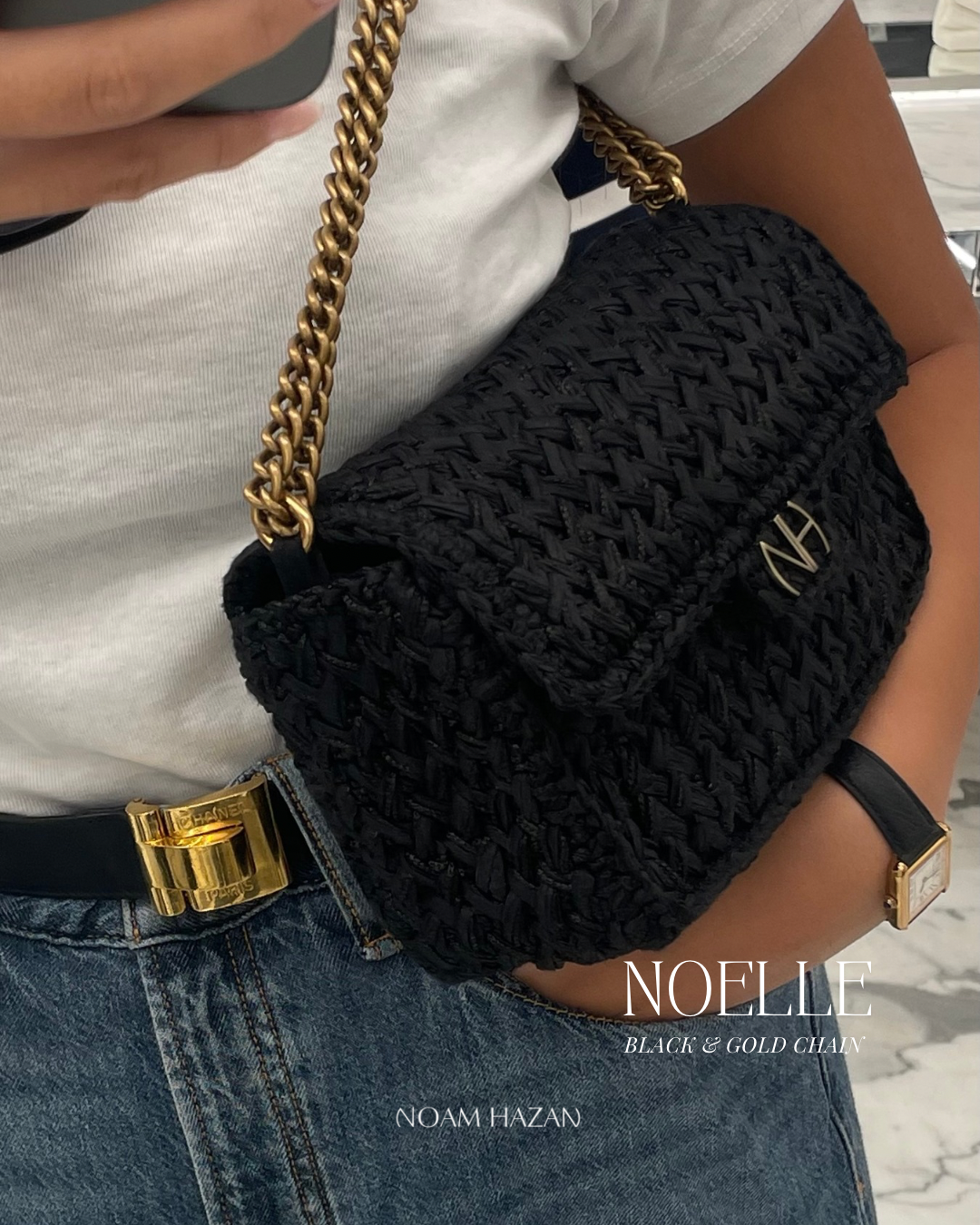 Meet the Noam Hazan Noelle Bag in Black—the everyday essential that never compromises on style. Hand-crocheted with a luxurious double-mixed yarn texture, this elegant flap bag features a refined cotton-linen interior lined with a practical inner pocket. The signature NH logo adorns the front, while a sleek golden or silver sliding chain offers versatile carrying—wear it on your shoulder for effortless elegance or cross-body for hands-free convenience. Born from a vision to create the perfect classic, the Noelle seamlessly transitions from work to weekend, delivering timeless sophistication with every wear.