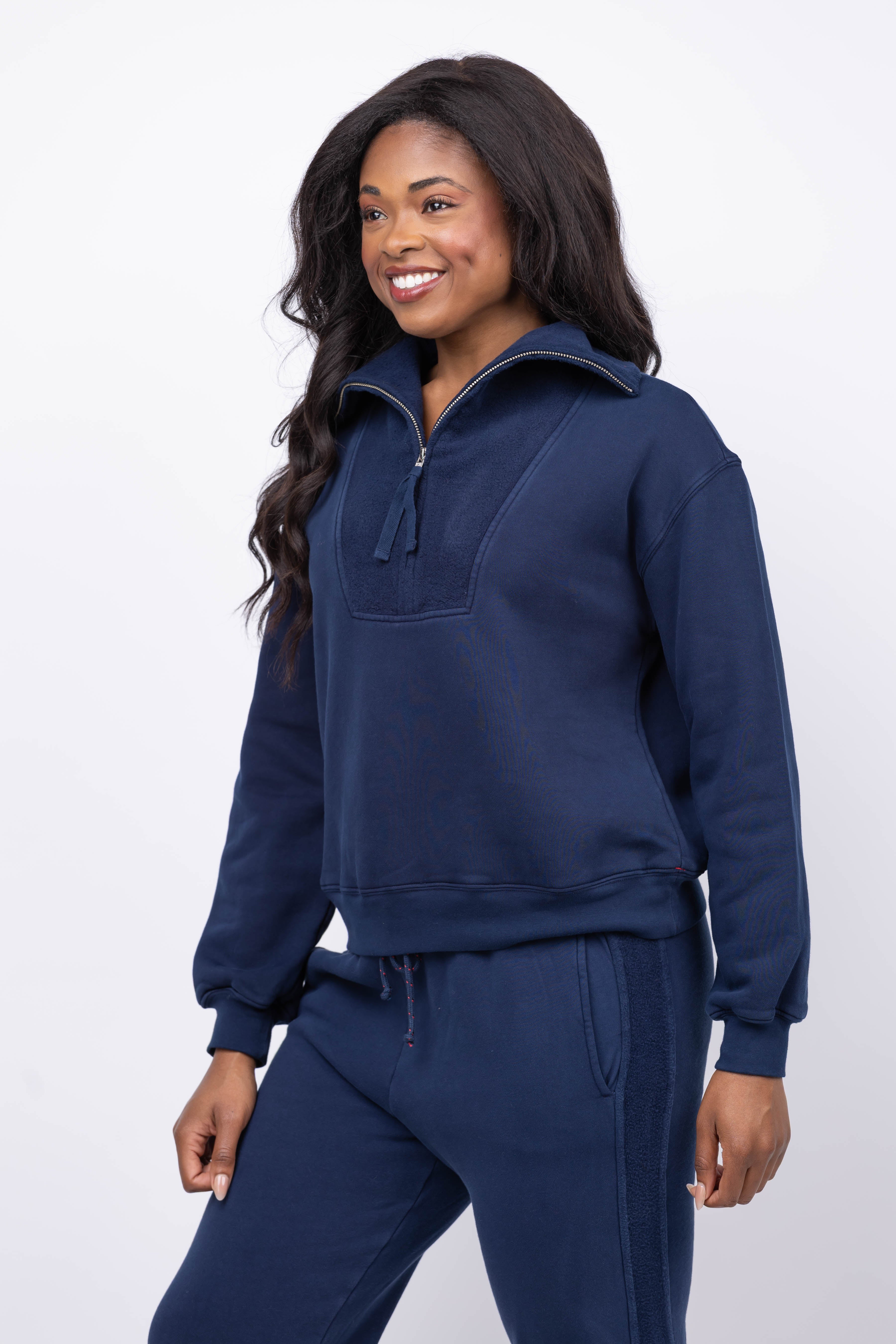 Experience ultimate comfort with the XiRENA Kat Sweatshirt in Navy. Crafted from ultra-soft fleece, this half-zip pullover features a cozy funnel neck with stylish contrast reverse fleece detail. Perfect for layering or wearing on its own, Kat combines warmth and effortless style, making it your go-to piece for cozy days. Elevate your casual wardrobe with this standout sweatshirt that promises both comfort and charm.