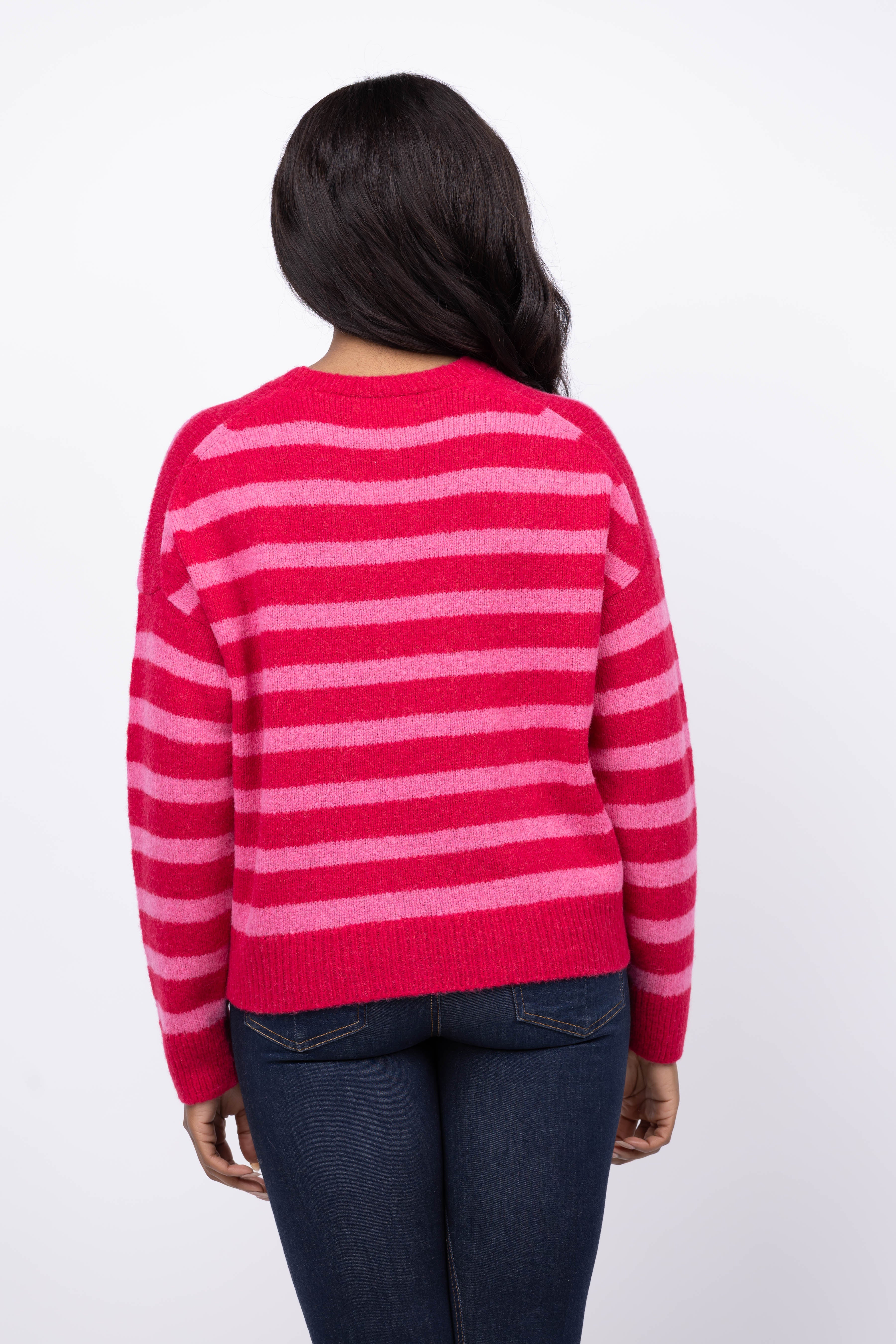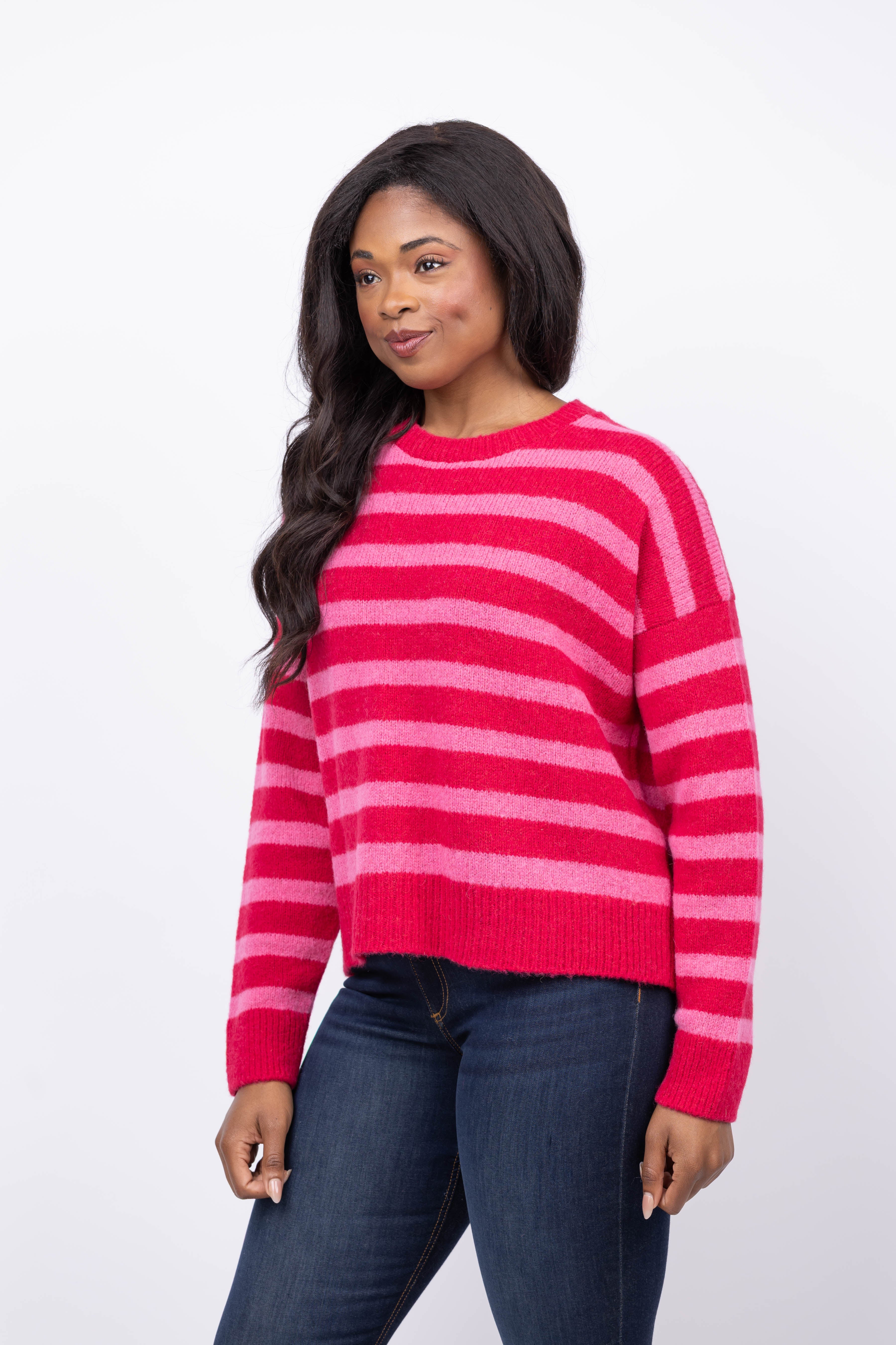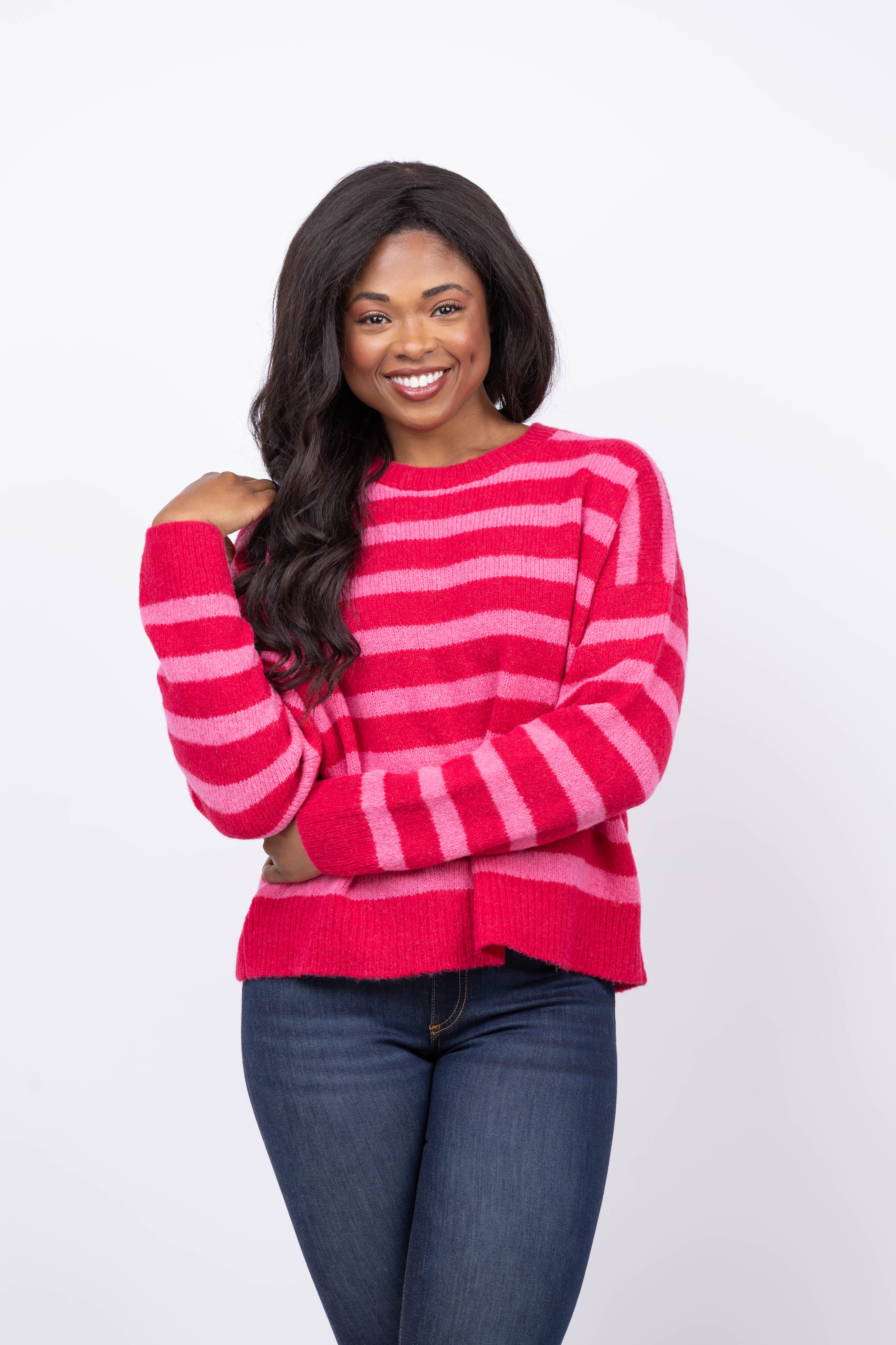Stay cozy and stylish with the XiRENA Lela Sweater in Red Rose. Made from a soft baby alpaca blend, this pullover brings extra warmth and texture for cooler days. Featuring bold contrast stripes, relaxed drop shoulders, and ribbed crew neck, cuffs, and hem, it offers a flattering fit with effortless charm. Perfect for adding a vibrant pop of color to your wardrobe.