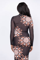 The MISA Los Angeles Elowen Top in Moroccan Snowflake combines elegance and comfort with its stretch knit jacquard fabric featuring a bold Kaleidoscope pattern. Its long sleeves and sleek turtleneck create a refined silhouette, while the subtle keyhole back with a button closure adds a delicate touch. Perfect for pairing with the coordinating Dena skirt for a striking ensemble or with jeans for an effortlessly chic everyday look. This top delivers versatile style and sophisticated detail for any wardrobe.