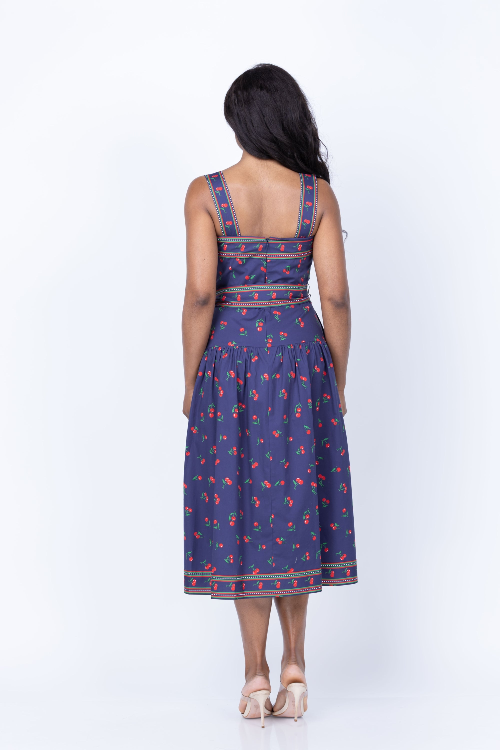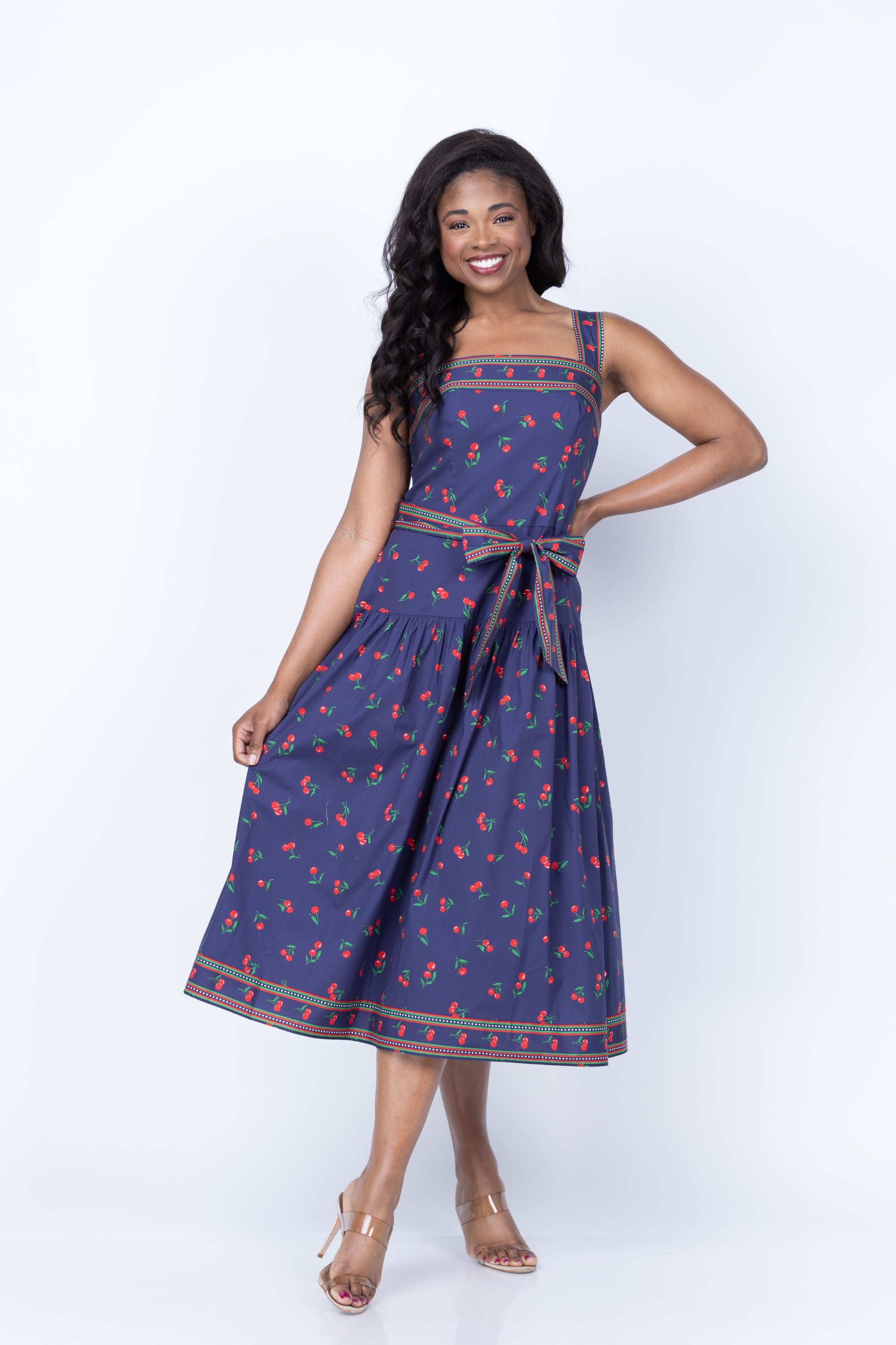 Embrace the season in this charming spring dress featuring a delightful cherry print with contrasting borders at the neckline, belt, and hem. The functional tie belt cinches at the waist for a flattering silhouette, while the lined bodice with inner boning provides comfortable support. Practical side seam pockets in the unlined skirt offer everyday convenience. A discreet center back invisible zip completes this effortlessly elegant style.