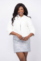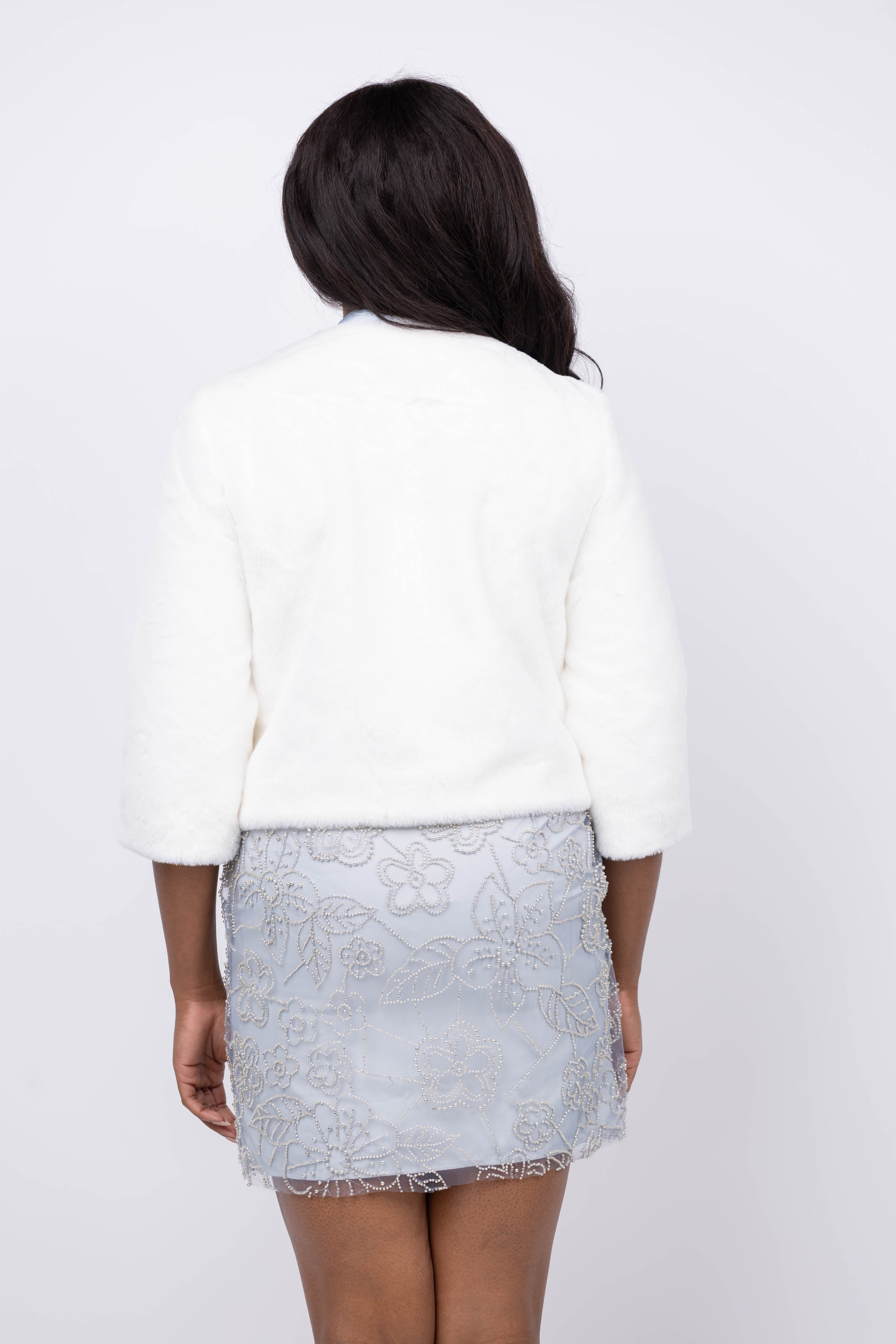 Elevate your style with the Tyler Boe Aspen Faux Fur Jacket in Ivory. Crafted from plush faux fur, this jacket offers a luxurious texture and modern glamour. Its cropped fit, collarless design, and hook-and-eye closure provide a sleek silhouette, while three-quarter sleeves add a chic touch. Perfect for adding warmth and sophistication to any outfit.