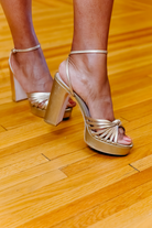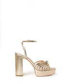 Elevate your style with the Loeffler Randall Rivka Knot Platform Sandal in stunning metallic champagne nappa leather. The elegant knotted mignon strap creates a luxurious focal point, while the 5-inch heel with 3.5-inch platform offers dramatic height with walkable comfort. The open toe design and adjustable ankle strap ensure both sophistication and security for all your special occasions.