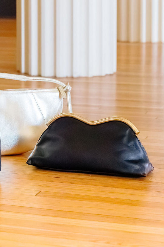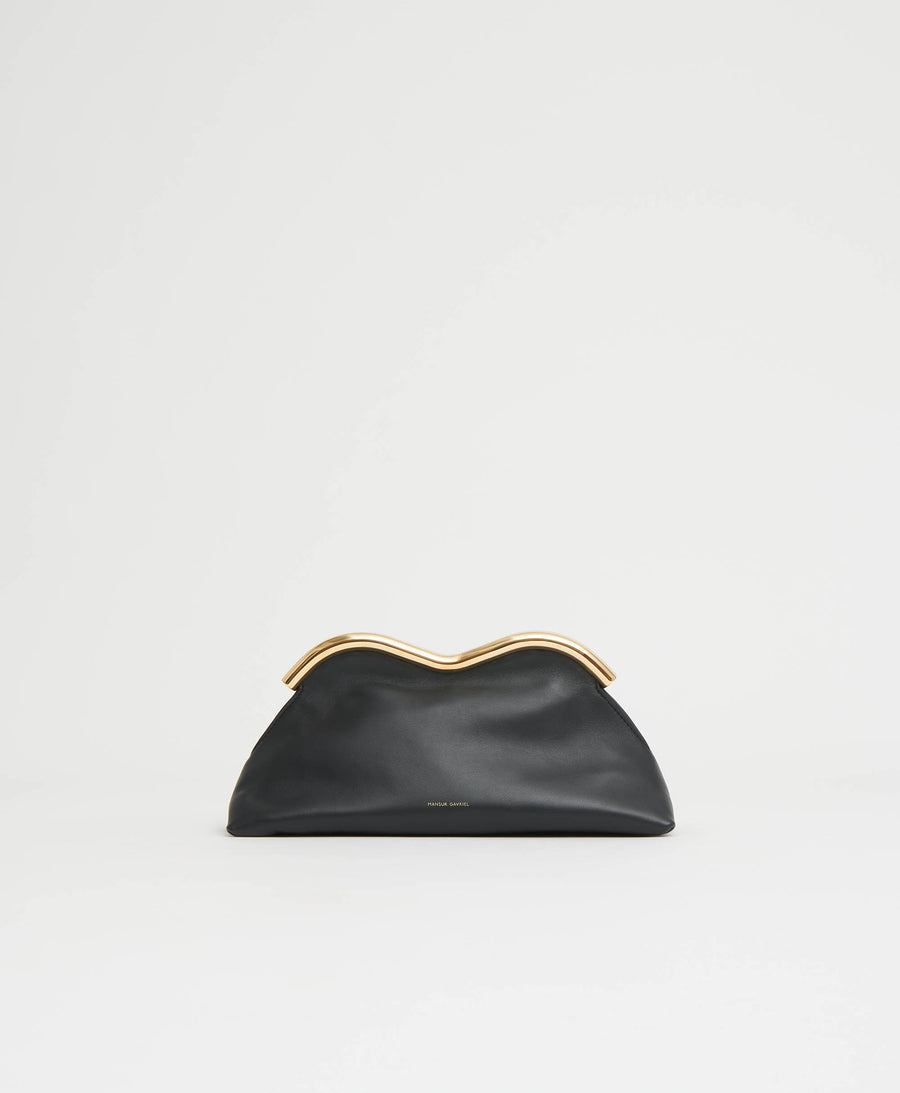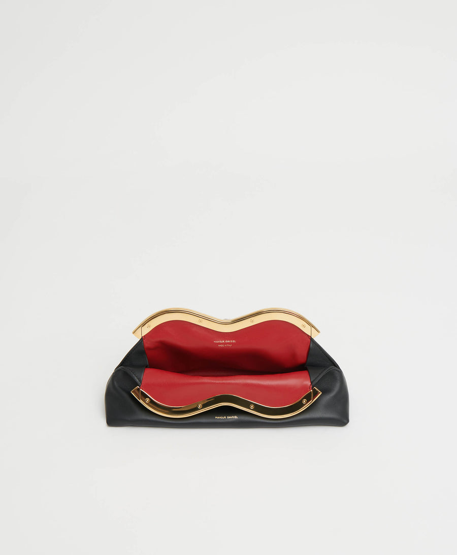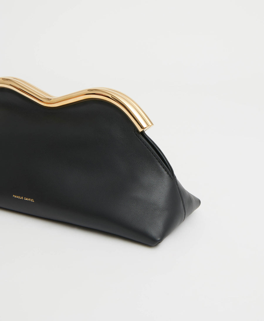 Introducing the Mansur Gavriel Baci Clutch Bag in Black/Flamma. Crafted from premium leather, its soft construction and exposed metal frame add a touch of elegance. Lined with Italian lambskin leather, it easily fits all phones in its spacious compartment. Stay organized and stylish on the go!