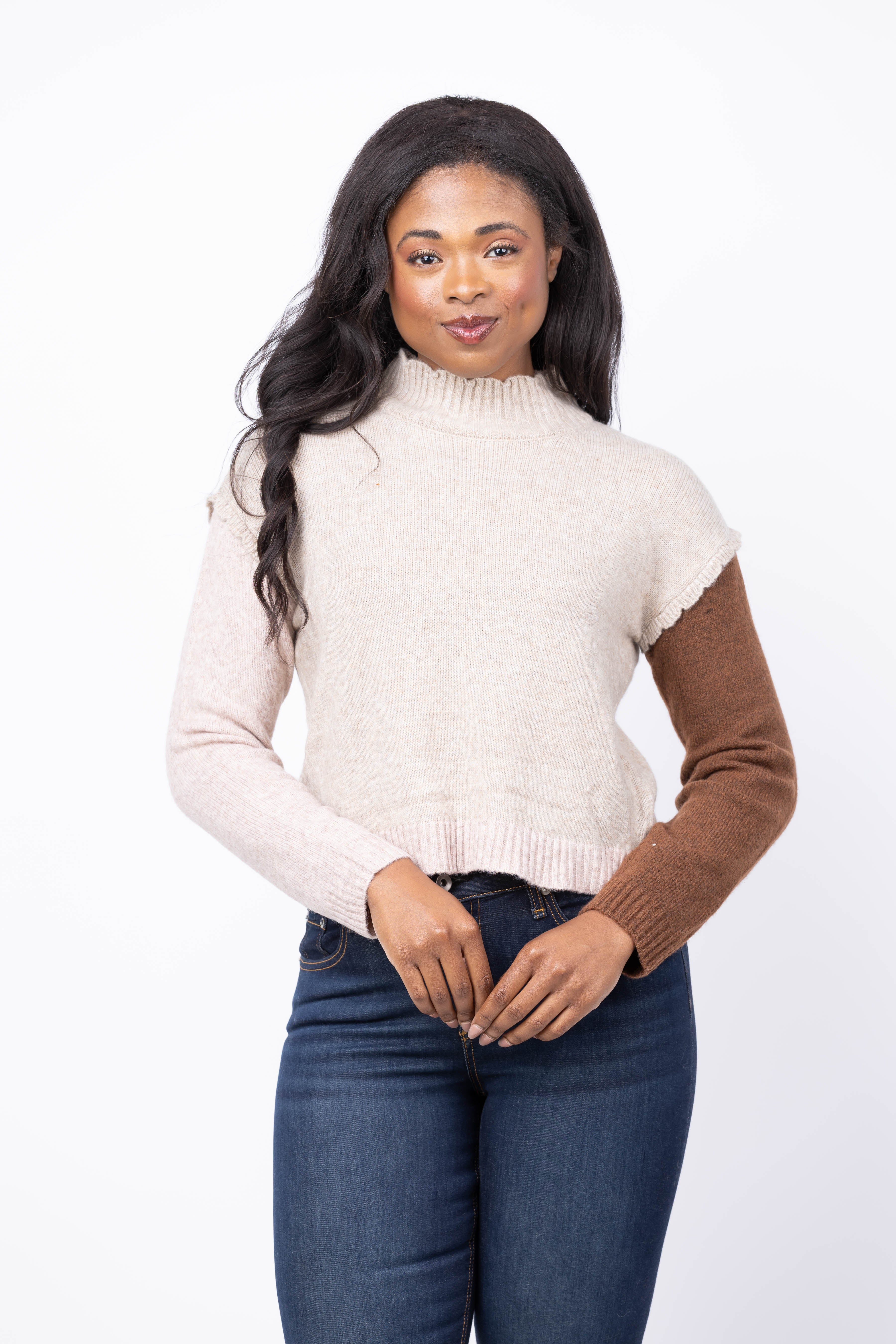 Introducing the Central Park West Olivia Ruffle Turtleneck—where comfort meets style. This soft knit sweater features a relaxed silhouette that moves with you throughout your day, while the high ribbed turtleneck topped with a delicate ruffle adds an effortlessly feminine edge. Mixed-knit sleeves create visual interest and texture, perfectly balanced by the structured ribbed hemline. Designed for those who refuse to compromise between cozy and chic, this pink combo piece is your new go-to layering essential.