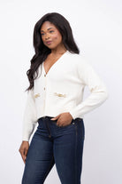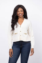 Experience unparalleled luxury with the Cinq à Sept Kavita Cashmere Cardigan in Ivory. Made from ultra-soft cashmere, this elegant cardigan offers cozy warmth while elevating your style. The distinctive gold embellishments on the front pockets add a refined touch, making it perfect for sophisticated layering throughout the season. Embrace comfort and chic versatility in one timeless piece.