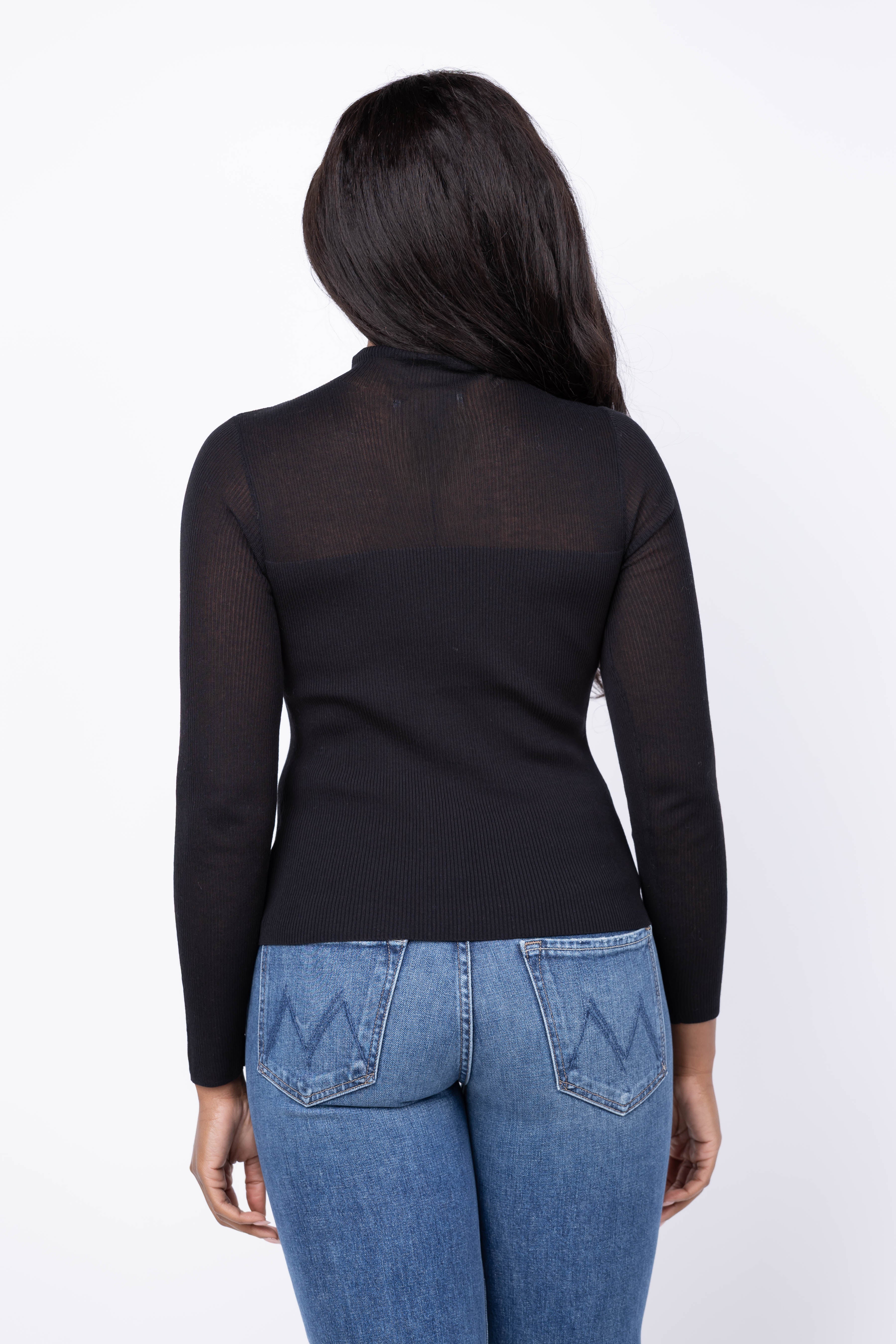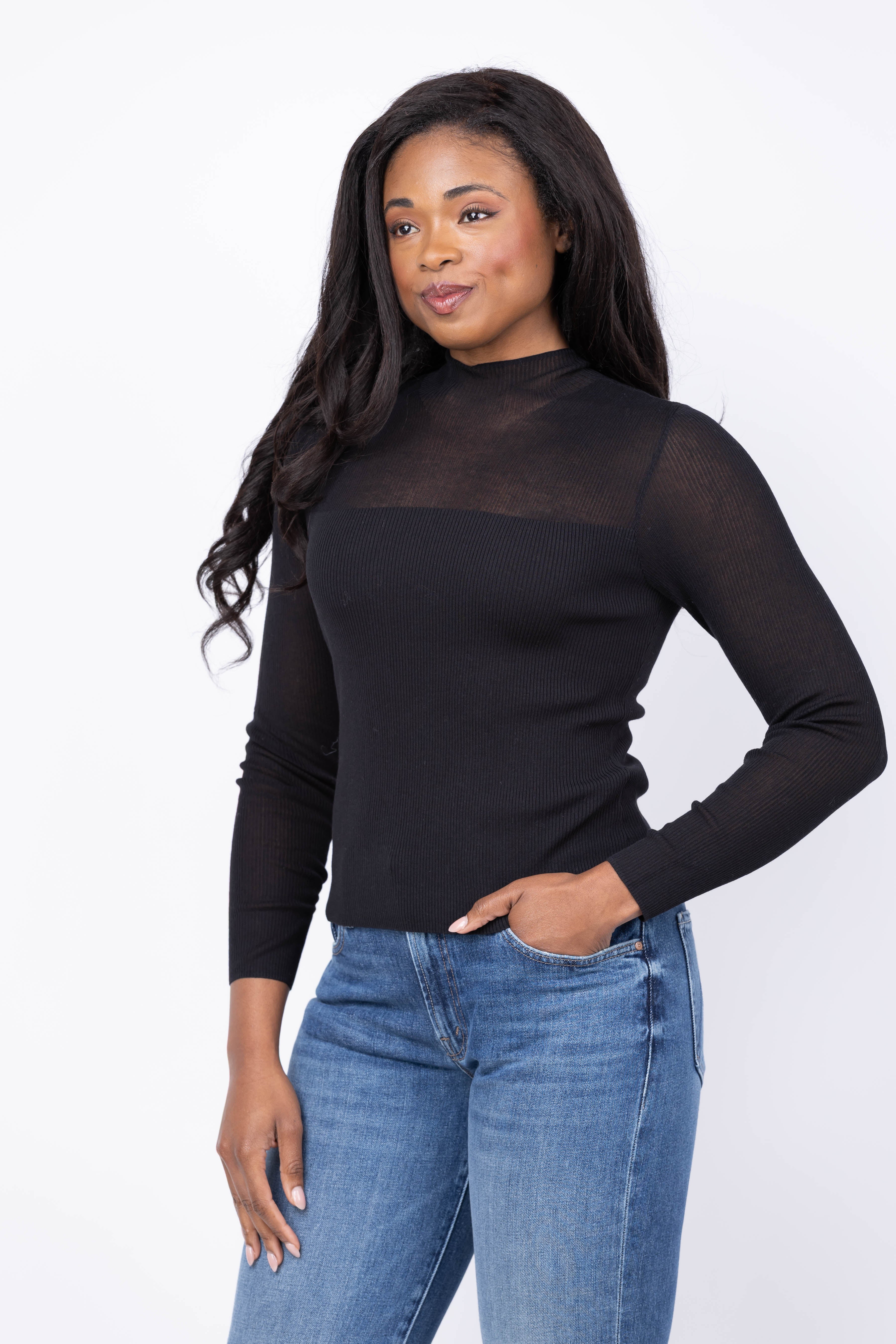 The DH New York Teanna Top in Black combines refined craftsmanship with modern edge. Crafted from fine gauge sweater knit, this piece features an all-over ribbing stitch that creates visual interest and ensures a flattering fit. The mock neckline provides structure and polish, while the subtly sheer effect at the yoke and sleeves adds an unexpected touch of sophistication. Layer it for depth or wear solo for understated elegance. This is the versatile essential that elevates your everyday wardrobe with texture and style.