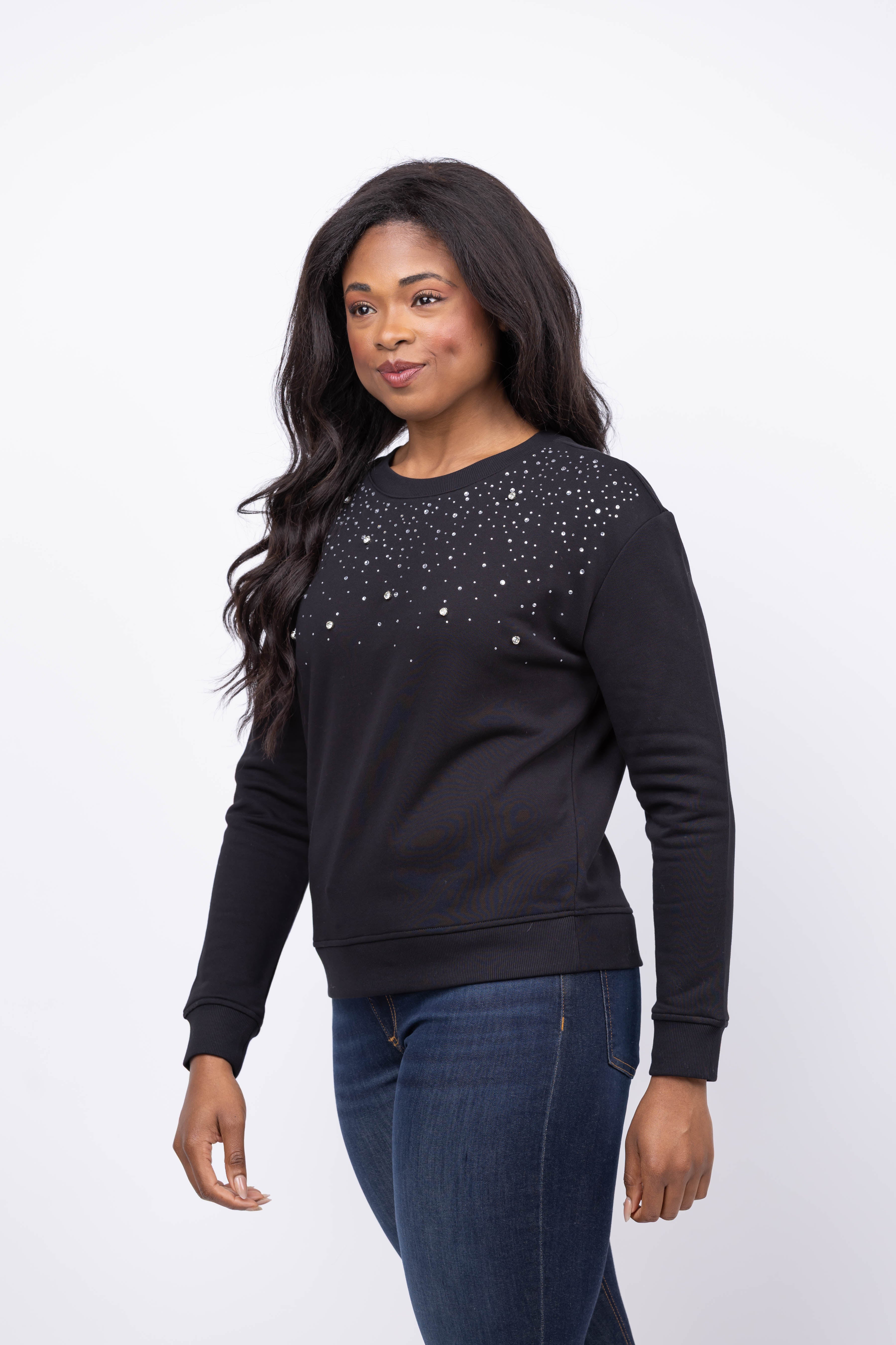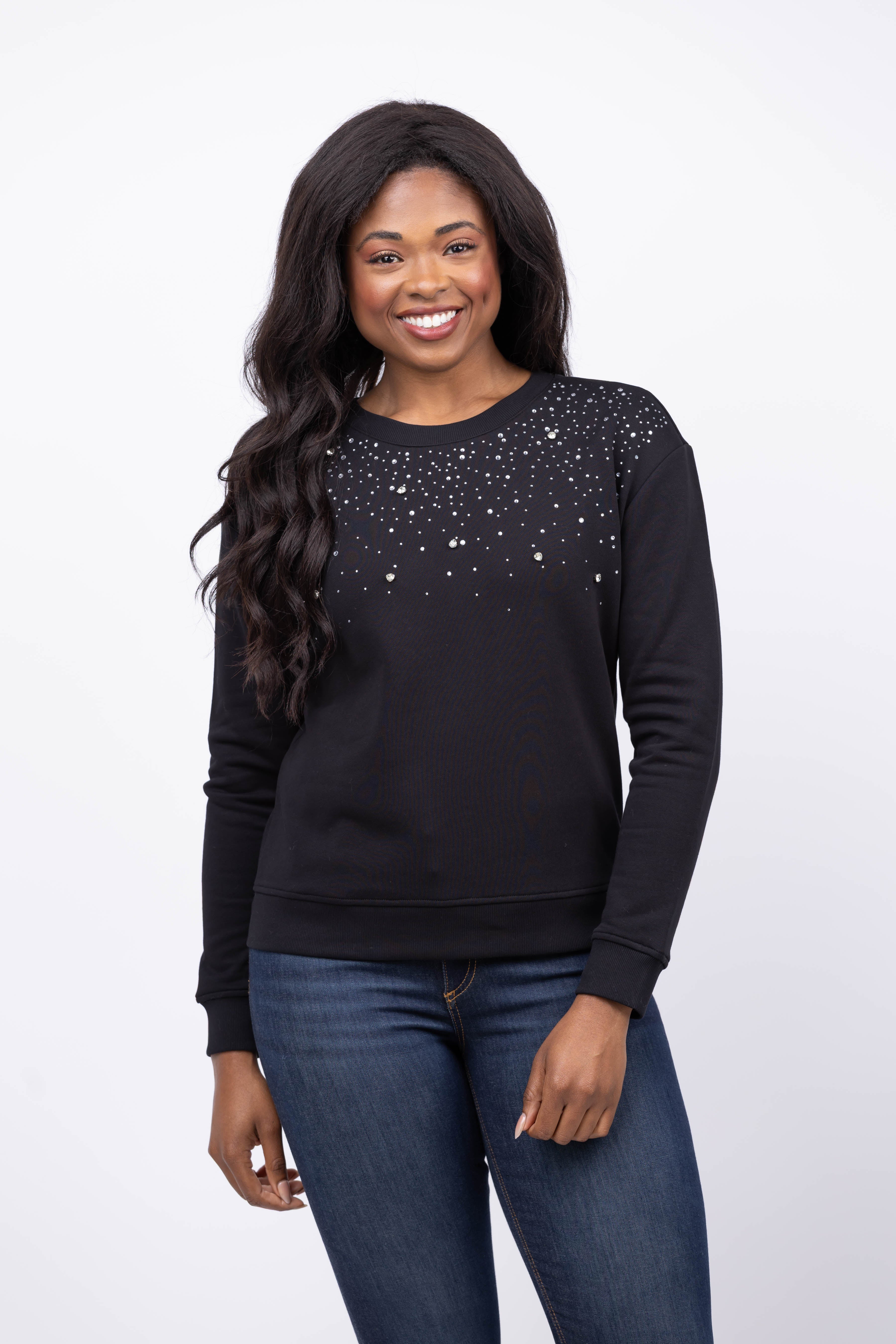 Elevate your wardrobe with the Elliott Lauren Rhinestone Sweater in Black. This crewneck sweater, adorned with subtle rhinestone embellishments, effortlessly balances sparkle and sophistication. Perfect for dressing up with tailored pants or down with your favorite jeans, it offers versatile style for any occasion. Experience comfort without sacrificing a touch of glamour.