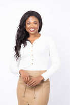 Elevate your wardrobe with the Karina Grimaldi Valentina Knit Top in Ivory—a versatile essential that works beautifully on its own or layered under your favorite pieces. Crafted from quality knit fabric, this top features charming button details that add dimension and visual interest. The timeless ivory hue pairs effortlessly with any color palette, making it the perfect foundation piece for endless styling possibilities. Whether you're dressing it up for a polished look or keeping it casual, this knit top adapts to your lifestyle with ease and sophistication.