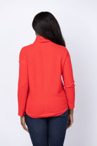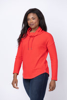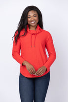 Elevate your everyday wardrobe with the Lilla P Rounded Hem Mock Neck in Fiesta. Crafted from our signature Textured Waffle fabric with subtle stretch, this piece maintains its shape through countless wears. The relaxed, scrunchy mock neck features an adjustable drawcord, letting you customize the fit to your preference. With its extended length and softly rounded hem, this versatile top transitions seamlessly from coordinated sets to casual pairings with yoga pants. Comfort meets effortless style in one essential layer.