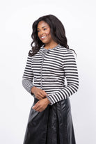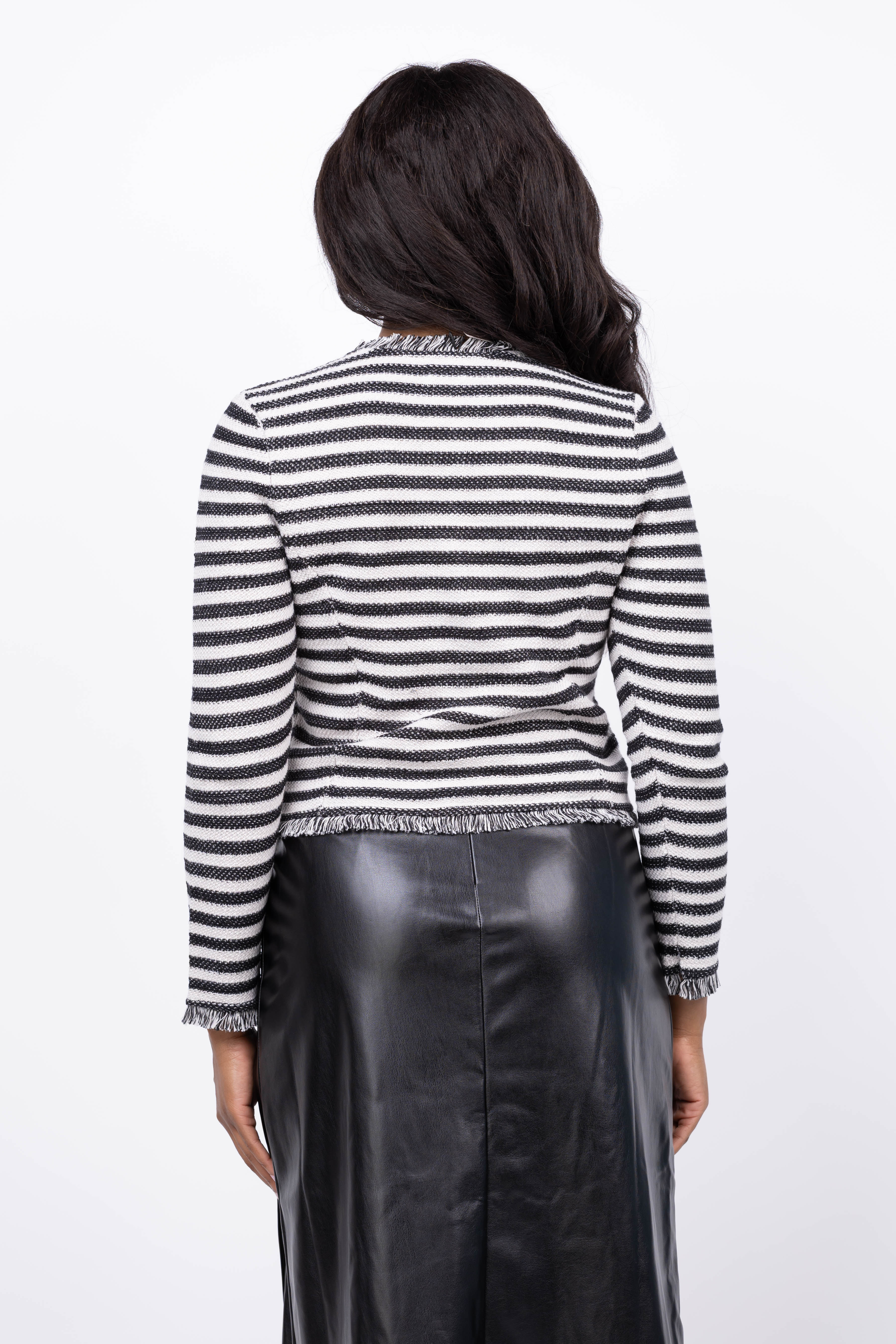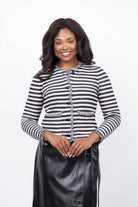 The Nic + Zoe Fringe Mix Femme Jacket in Black Multi combines the sharp look of a blazer with the cozy feel of your favorite cardigan. Crafted from super-soft knit fabric, it offers unmatched comfort and versatility. Perfect for work, social events, or a casual day out, this jacket effortlessly elevates any outfit. Eye-catching fringe detailing along the edges adds a stylish touch that highlights the knit’s rich texture and quality. Make this jacket your new everyday essential for effortless style and comfort.