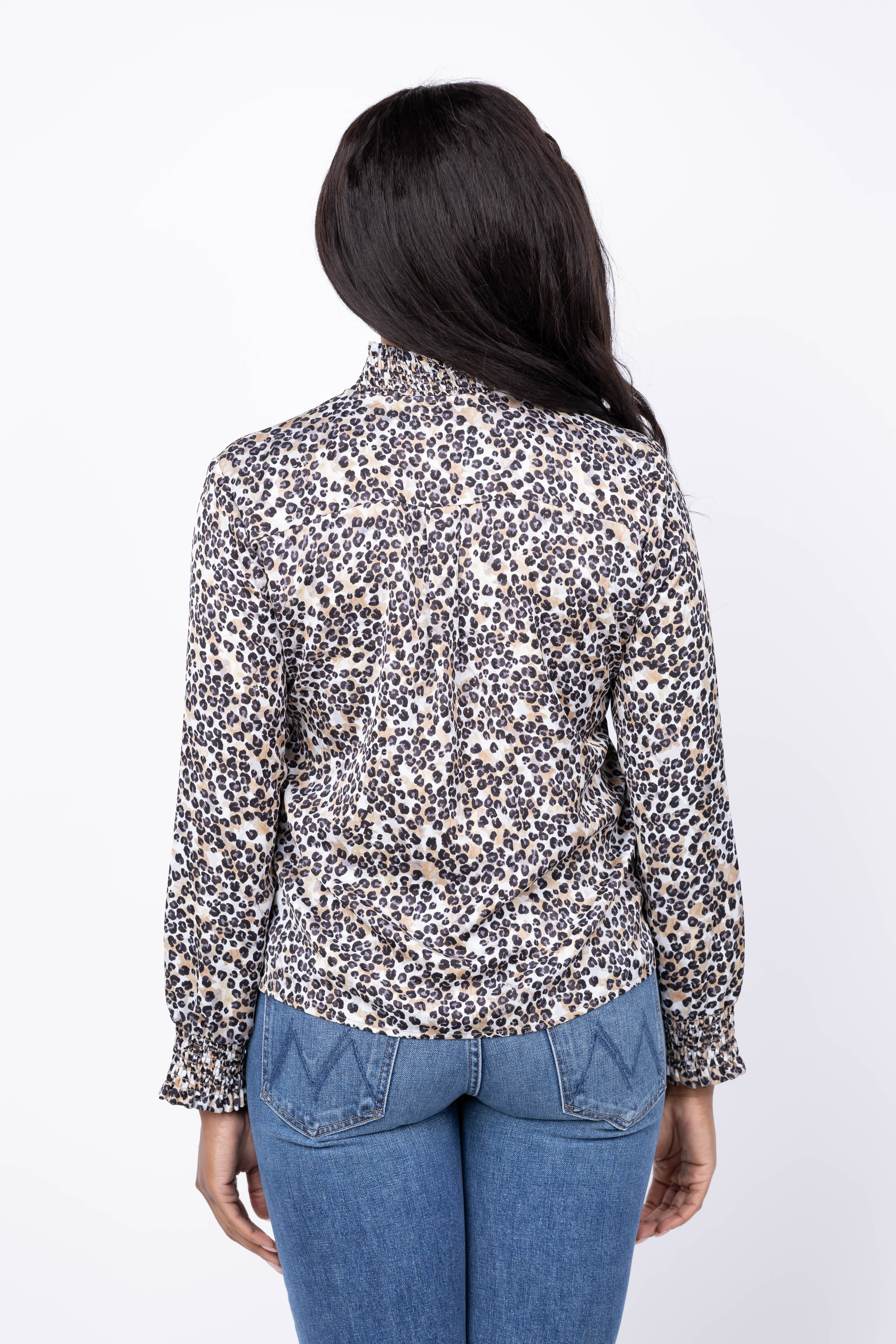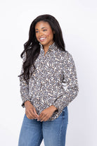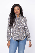 Introduce understated edge to your everyday style with the NIC + ZOE Little Leopard Top. This sophisticated blouse showcases a contemporary geo-inspired leopard print in a calming neutral palette that complements virtually any piece in your closet. Crafted from lightweight satin chiffon, it drapes beautifully while remaining breathable and comfortable. Delicate smocking at the collar and cuffs adds refined feminine detail, while the relaxed silhouette ensures you can wear it effortlessly from desk to dinner. A versatile essential that elevates basics and transforms your go-to pieces into polished, intentional looks.