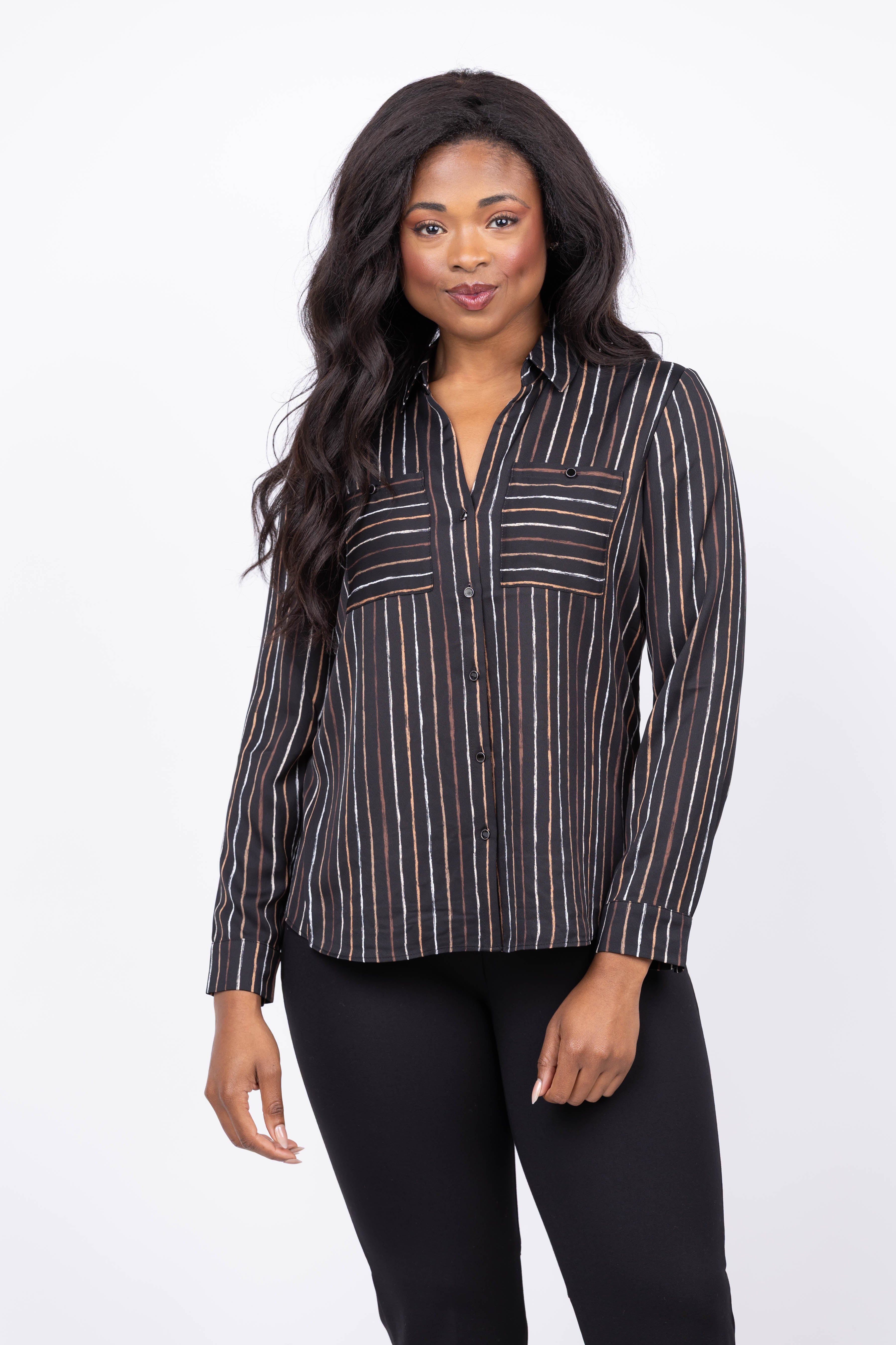 Discover the updated Nic + Zoe Mini Painted Stripe Shirt, redesigned with fresh colors to suit your busiest office days, elegant evenings, or relaxed weekends. The thoughtful reverse striping on the chest pockets adds visual interest and highlights superior craftsmanship. Crafted from satin chiffon, this shirt offers a sleek finish and comfortable wear throughout your day. Elevate your wardrobe with a versatile piece that balances sophistication and ease effortlessly.