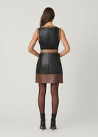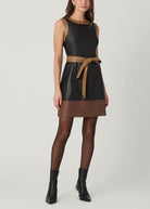 Elevate your wardrobe with the Shoshanna Shanti Dress, a chic faux-leather mini featuring a timeless shift silhouette. Wear it with or without the belt tie to switch up your look effortlessly. Color-blocking at the neckline, armholes, skirt, and belt adds a modern edge to classic style. Fully lined and equipped with a hidden center-back zipper for comfort and ease. Perfect for making a bold statement wherever you go.