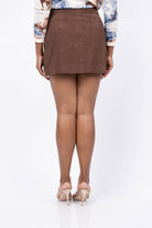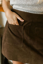 Crafted from soft suede, the Tanya Taylor Fran Skirt in Chocolate combines fall-ready warmth with stylish detail. Its A-line silhouette and front patch pockets add a playful yet polished touch, making it perfect for effortless, everyday dressing with a confident edge.