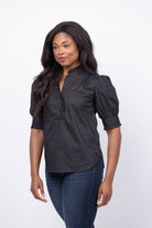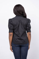 The Trovata Noah Blouse in Black redefines the classic button-down with feminine flair. Crafted from crisp cotton poplin, it features a standup collar and center front placket adorned with delicate self-fabric ruffles. Half sleeves gather into ruffled cuffs, adding elegant detail to this versatile blouse—perfect for elevating your everyday wardrobe.