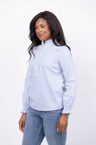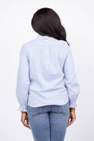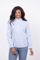 Elevate your wardrobe with the Tyler Boe Gwen Pinstripe Ruffle Top in Multi. Combining classic pinstripe tailoring with feminine ruffle details at the neckline and smocked cuffs, this button-down shirt offers a refined, flattering fit. Its half placket design adds subtle charm, making it perfect for the office or sophisticated casual looks. Effortlessly enhance your style and confidence with this versatile top.